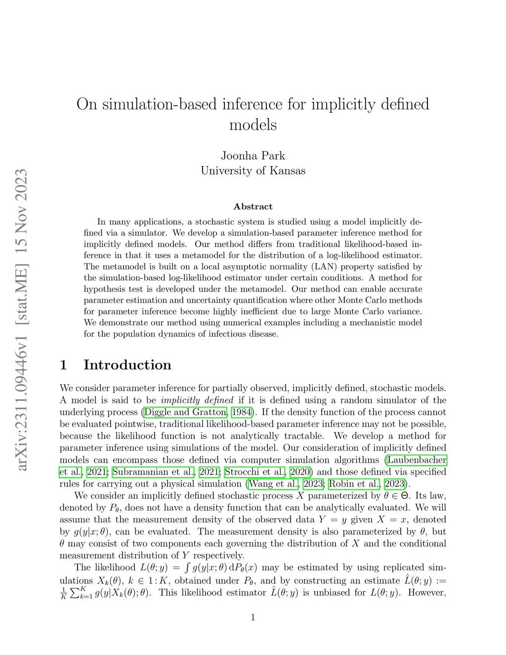 In many applications, a stochastic system is studied using a model implicitly defined via a simulator. We develop a simulation-based parameter inference method for implicitly defined models. Our method differs from traditional likelihood-based inference in that it uses a metamodel for the distribution of a log-likelihood estimator. The metamodel is built on a local asymptotic normality (LAN) property satisfied by the simulation-based log-likelihood estimator under certain conditions. A method for hypothesis test is developed under the metamodel. Our method can enable accurate parameter estimation and uncertainty quantification where other Monte Carlo methods for parameter inference become highly inefficient due to large Monte Carlo variance. We demonstrate our method using numerical examples including a mechanistic model for the population dynamics of infectious disease.