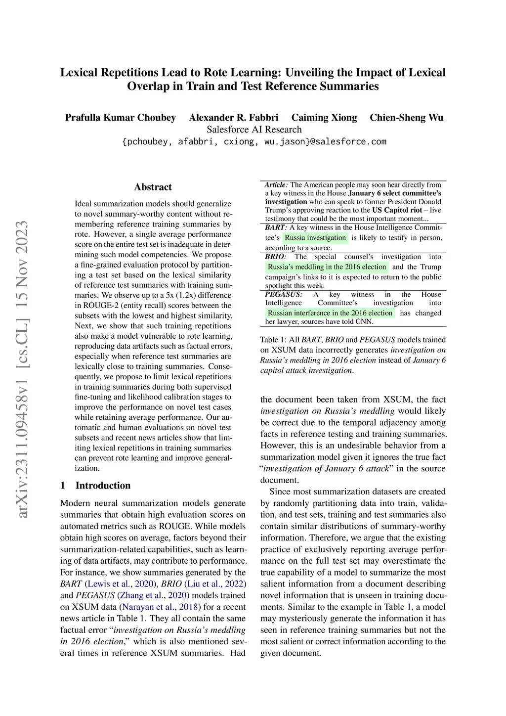 Ideal summarization models should generalize to novel summary-worthy content without remembering reference training summaries by rote. However, a single average performance score on the entire test set is inadequate in determining such model competencies. We propose a fine-grained evaluation protocol by partitioning a test set based on the lexical similarity of reference test summaries with training summaries. We observe up to a 5x (1.2x) difference in ROUGE-2 (entity recall) scores between the subsets with the lowest and highest similarity. Next, we show that such training repetitions also make a model vulnerable to rote learning, reproducing data artifacts such as factual errors, especially when reference test summaries are lexically close to training summaries. Consequently, we propose to limit lexical repetitions in training summaries during both supervised fine-tuning and likelihood calibration stages to improve the performance on novel test cases while retaining average performance. Our automatic and human evaluations on novel test subsets and recent news articles show that limiting lexical repetitions in training summaries can prevent rote learning and improve generalization.