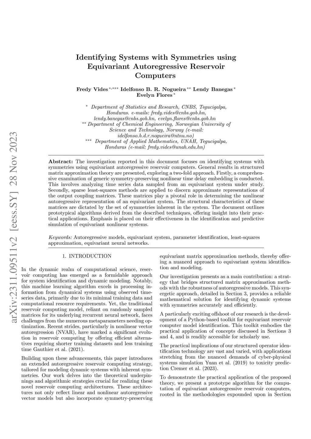 The investigation reported in this document focuses on identifying systems with symmetries using equivariant autoregressive reservoir computers. General results in structured matrix approximation theory are presented, exploring a two-fold approach. Firstly, a comprehensive examination of generic symmetry-preserving nonlinear time delay embedding is conducted. This involves analyzing time series data sampled from an equivariant system under study. Secondly, sparse least-squares methods are applied to discern approximate representations of the output coupling matrices. These matrices play a critical role in determining the nonlinear autoregressive representation of an equivariant system. The structural characteristics of these matrices are dictated by the set of symmetries inherent in the system. The document outlines prototypical algorithms derived from the described techniques, offering insight into their practical applications. Emphasis is placed on the significant improvement on structured identification precision when compared to classical reservoir computing methods for the simulation of equivariant dynamical systems.