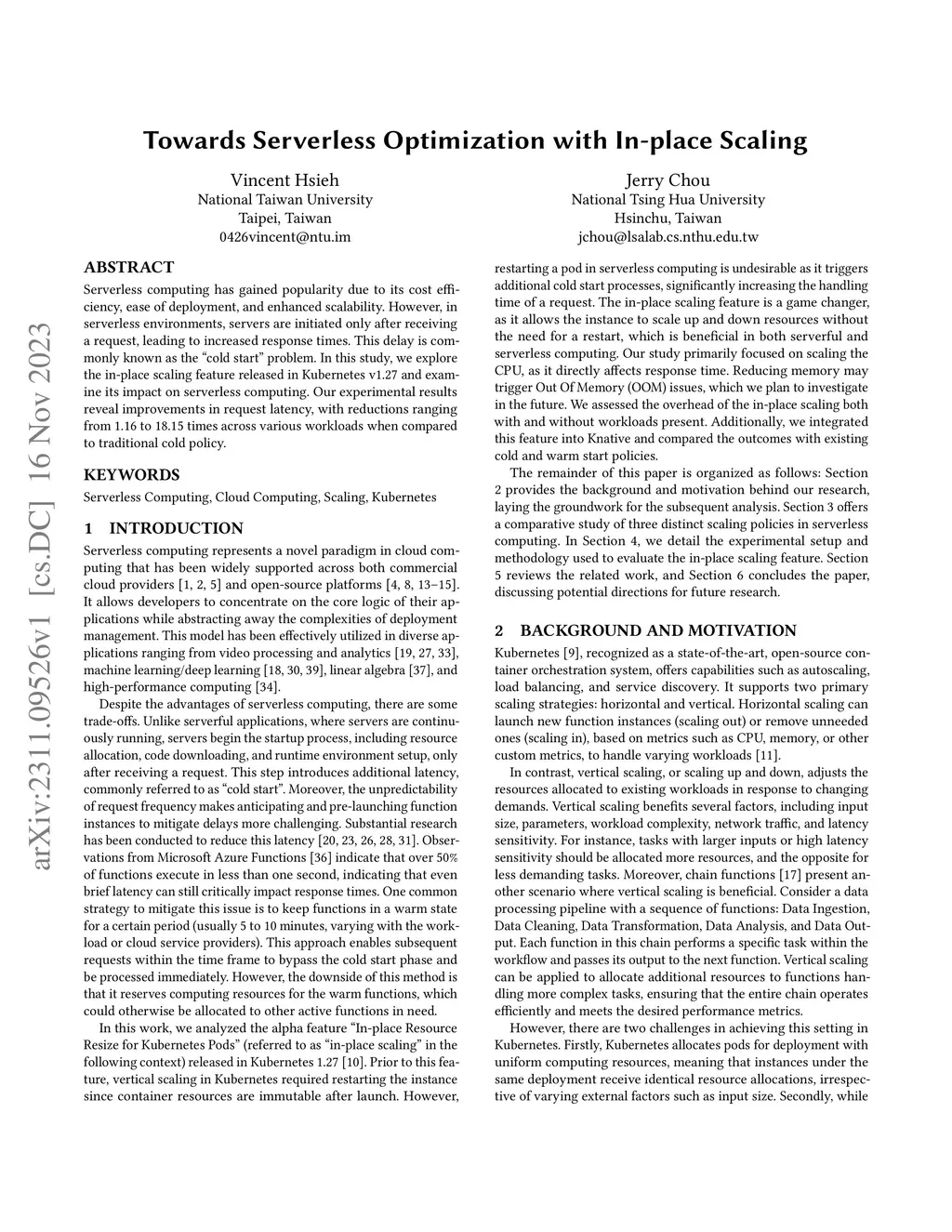Serverless computing has gained popularity due to its cost efficiency, ease of deployment, and enhanced scalability. However, in serverless environments, servers are initiated only after receiving a request, leading to increased response times. This delay is commonly known as the cold start problem. In this study, we explore the in-place scaling feature released in Kubernetes v1.27 and examine its impact on serverless computing. Our experimental results reveal improvements in request latency, with reductions ranging from 1.16 to 18.15 times across various workloads when compared to traditional cold policy.