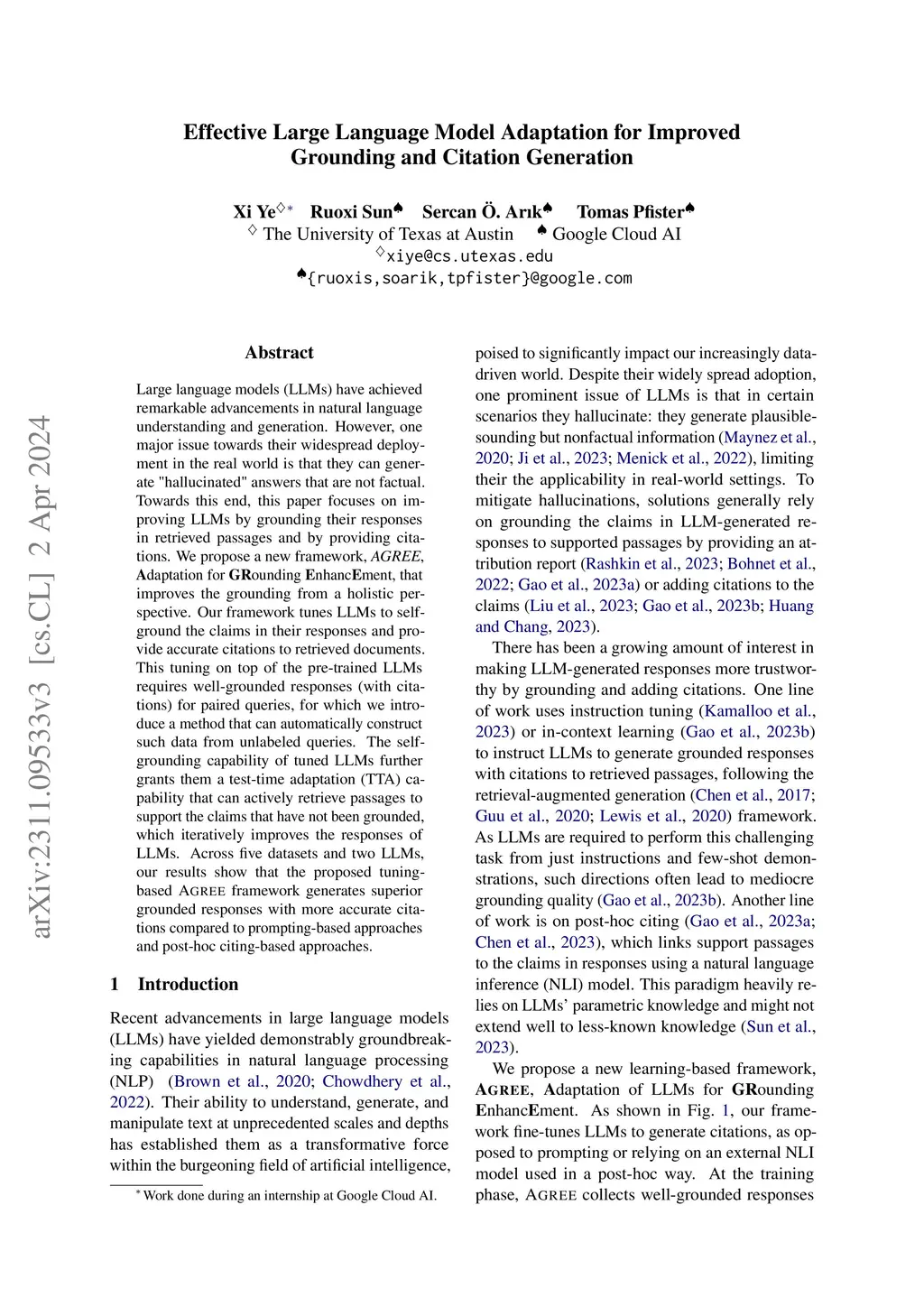 Large language models (LLMs) have achieved remarkable advancements in natural language understanding and generation. However, one major issue towards their widespread deployment in the real world is that they can generate "hallucinated" answers that are not factual. Towards this end, this paper focuses on improving LLMs by grounding their responses in retrieved passages and by providing citations. We propose a new framework, AGREE, Adaptation for GRounding EnhancEment, that improves the grounding from a holistic perspective. Our framework tunes LLMs to selfground the claims in their responses and provide accurate citations to retrieved documents. This tuning on top of the pre-trained LLMs requires well-grounded responses (with citations) for paired queries, for which we introduce a method that can automatically construct such data from unlabeled queries. The selfgrounding capability of tuned LLMs further grants them a test-time adaptation (TTA) capability that can actively retrieve passages to support the claims that have not been grounded, which iteratively improves the responses of LLMs. Across five datasets and two LLMs, our results show that the proposed tuningbased AGREE framework generates superior grounded responses with more accurate citations compared to prompting-based approaches and post-hoc citing-based approaches
