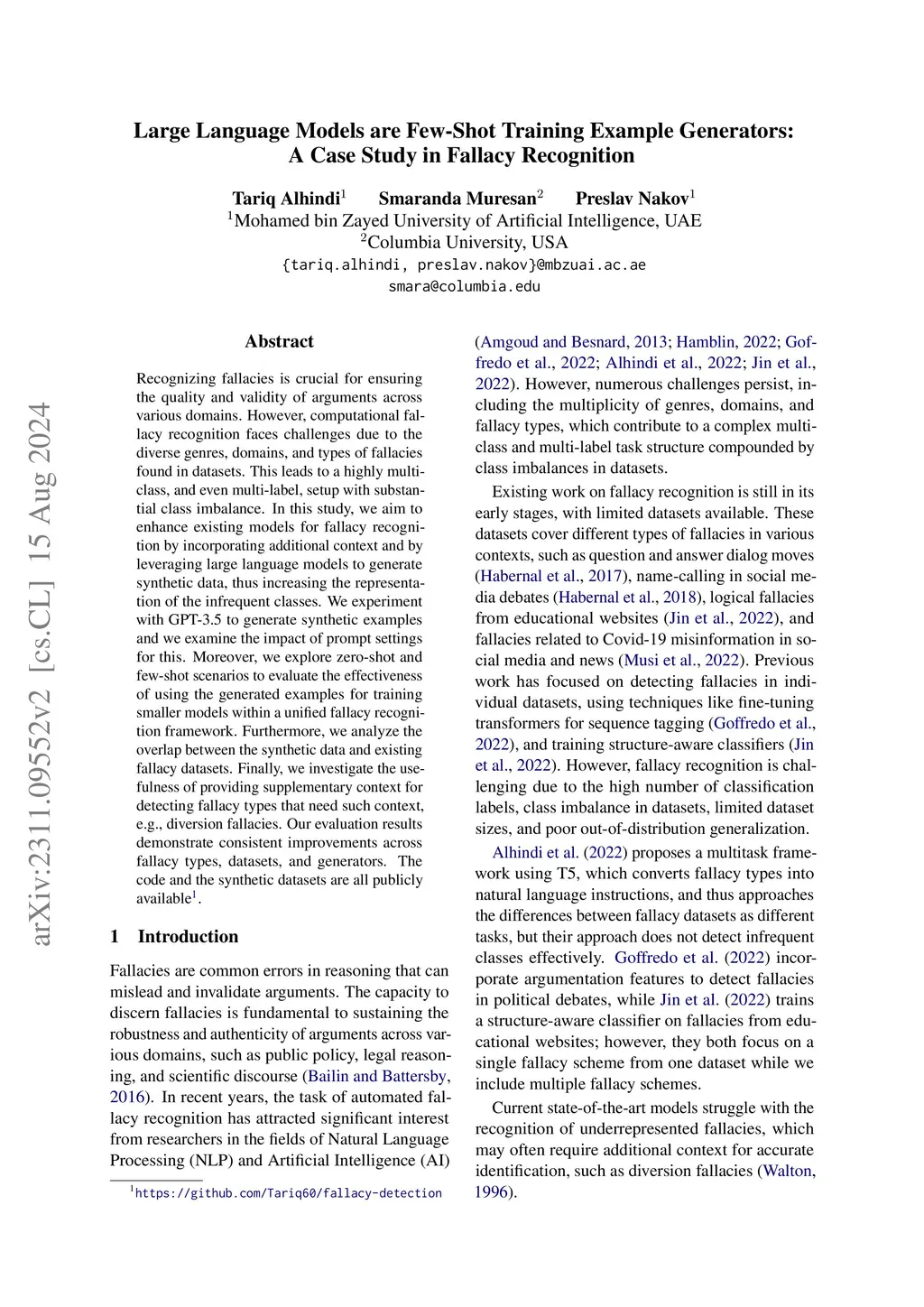 Recognizing fallacies is crucial for ensuring the quality and validity of arguments across various domains. However, computational fallacy recognition faces challenges due to the diverse genres, domains, and types of fallacies found in datasets. This leads to a highly multiclass, and even multi-label, setup with substantial class imbalance. In this study, we aim to enhance existing models for fallacy recognition by incorporating additional context and by leveraging large language models to generate synthetic data, thus increasing the representation of the infrequent classes. We experiment with GPT3.5 to generate synthetic examples and we examine the impact of prompt settings for this. Moreover, we explore zero-shot and few-shot scenarios to evaluate the effectiveness of using the generated examples for training smaller models within a unified fallacy recognition framework. Furthermore, we analyze the overlap between the synthetic data and existing fallacy datasets. Finally, we investigate the usefulness of providing supplementary context for detecting fallacy types that need such context, e.g., diversion fallacies. Our evaluation results demonstrate consistent improvements across fallacy types, datasets, and generators.