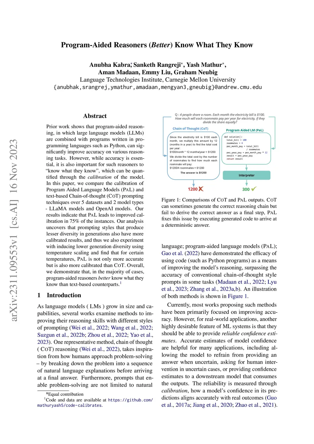 Prior work shows that program-aided reasoning, in which large language models (LLMs) are combined with programs written in programming languages such as Python, can significantly improve accuracy on various reasoning tasks. However, while accuracy is essential, it is also important for such reasoners to "know what they know", which can be quantified through the calibration of the model. In this paper, we compare the calibration of Program Aided Language Models (PAL) and text-based Chain-of-thought (COT) prompting techniques over 5 datasets and 2 model types: LLaMA models and OpenAI models. Our results indicate that PAL leads to improved calibration in 75% of the instances. Our analysis uncovers that prompting styles that produce lesser diversity in generations also have more calibrated results, and thus we also experiment with inducing lower generation diversity using temperature scaling and find that for certain temperatures, PAL is not only more accurate but is also more calibrated than COT. Overall, we demonstrate that, in the majority of cases, program-aided reasoners better know what they know than text-based counterparts.