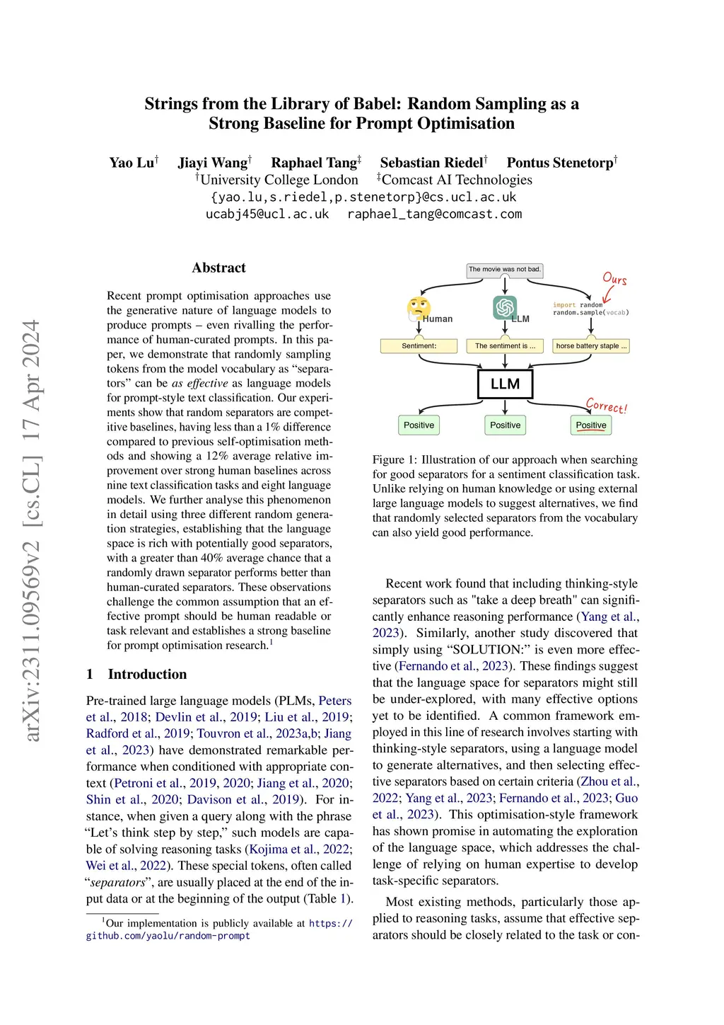 Recent prompt optimisation approaches use the generative nature of language models to produce prompts -- even rivaling the performance of human-curated prompts. In this paper, we demonstrate that randomly sampling tokens from the model vocabulary as ``separators'' can be as effective as language models for prompt-style text classification. Our experiments show that random separators are competitive baselines, having less than a 1% difference compared to previous self-optimisation methods and showing a 12% average relative improvement over strong human baselines across nine text classification tasks and eight language models. We further analyse this phenomenon in detail using three different random generation strategies, establishing that the language space is rich with potentially good separators, with a greater than 40% average chance that a randomly drawn separator performs better than human-curated separators. These observations challenge the common assumption that an effective prompt should be human readable or task relevant and establish a strong baseline for prompt optimisation research.