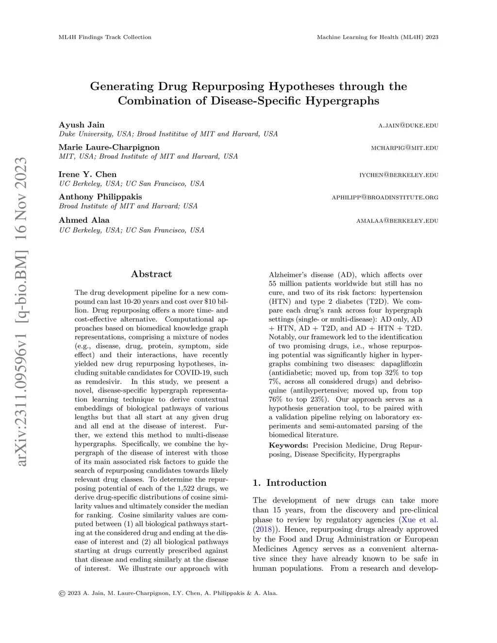 The drug development pipeline for a new compound can last 10-20 years and cost over 10 billion. Drug repurposing offers a more time- and cost-effective alternative. Computational approaches based on biomedical knowledge graph representations have recently yielded new drug repurposing hypotheses. In this study, we present a novel, disease-specific hypergraph representation learning technique to derive contextual embeddings of biological pathways of various lengths but that all start at any given drug and all end at the disease of interest. Further, we extend this method to multi-disease hypergraphs. To determine the repurposing potential of each of the 1,522 drugs, we derive drug-specific distributions of cosine similarity values and ultimately consider the median for ranking. Cosine similarity values are computed between (1) all biological pathways starting at the considered drug and ending at the disease of interest and (2) all biological pathways starting at drugs currently prescribed against that disease and ending at the disease of interest. We illustrate our approach with Alzheimer's disease (AD) and two of its risk factors: hypertension (HTN) and type 2 diabetes (T2D). We compare each drug's rank across four hypergraph settings (single- or multi-disease): AD only, AD + HTN, AD + T2D, and AD + HTN + T2D. Notably, our framework led to the identification of two promising drugs whose repurposing potential was significantly higher in hypergraphs combining two diseases: dapagliflozin (antidiabetic; moved up, from top 32 to top 7, across all considered drugs) and debrisoquine (antihypertensive; moved up, from top 76 to top 23). Our approach serves as a hypothesis generation tool, to be paired with a validation pipeline relying on laboratory experiments and semi-automated parsing of the biomedical literature.