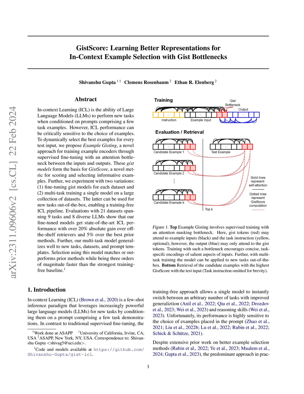 In-context Learning (ICL) is the ability of Large Language Models (LLMs) to perform new tasks when conditioned on prompts comprising a few task examples. However, ICL performance can be critically sensitive to the choice of examples. To dynamically select the best examples for every test input, we propose Example Gisting, a novel approach for training example encoders through supervised fine-tuning with an attention bottleneck between the inputs and outputs. These gist models form the basis for GistScore, a novel metric for scoring and selecting informative examples. Further, we experiment with two variations: (1) fine-tuning gist models for each dataset and (2) multi-task training a single model on a large collection of datasets. The latter can be used for new tasks out-of-the-box, enabling a training-free ICL pipeline. Evaluations with 21 datasets spanning 9 tasks and 8 diverse LLMs show that our fine-tuned models get state-of-the-art ICL performance with over 20% absolute gain over off-the-shelf retrievers and 5% over the best prior methods. Further, our multi-task model generalizes well to new tasks, datasets, and prompt templates. Selection using this model matches or outperforms prior methods while being three orders of magnitude faster than the strongest training-free baseline.