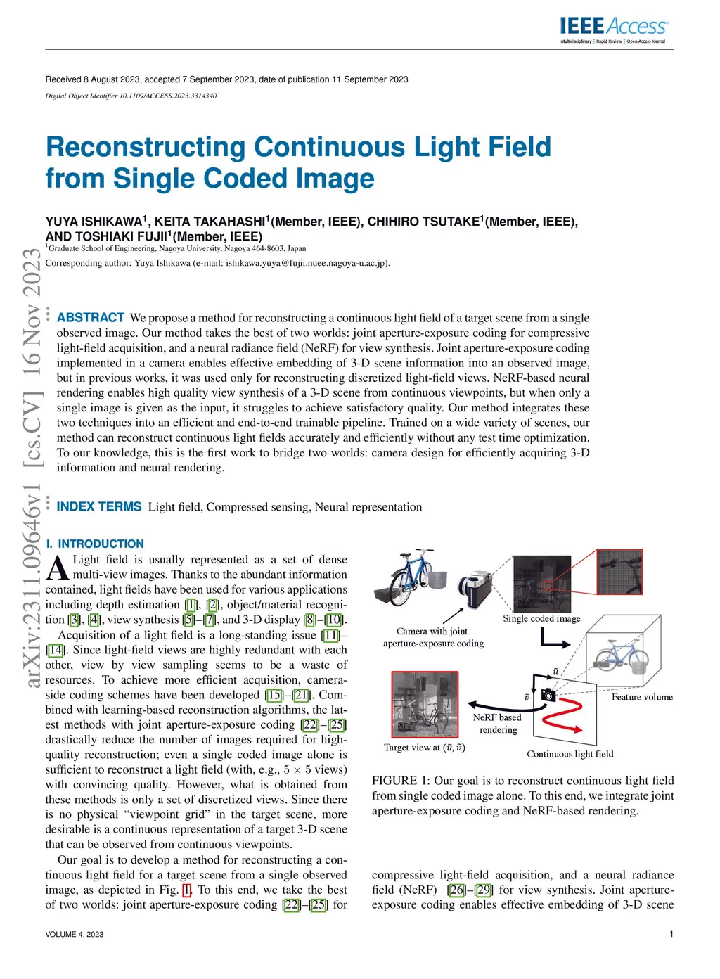 We propose a method for reconstructing a continuous light field of a target scene from a single observed image. Our method takes the best of two worlds: joint aperture-exposure coding for compressive light-field acquisition, and a neural radiance field (NeRF) for view synthesis. Joint aperture-exposure coding implemented in a camera enables effective embedding of 3-D scene information into an observed image, but in previous works, it was used only for reconstructing discretized light-field views. NeRF-based neural rendering enables high quality view synthesis of a 3-D scene from continuous viewpoints, but when only a single image is given as the input, it struggles to achieve satisfactory quality. Our method integrates these two techniques into an efficient and end-to-end trainable pipeline. Trained on a wide variety of scenes, our method can reconstruct continuous light fields accurately and efficiently without any test time optimization. To our knowledge, this is the first work to bridge two worlds: camera design for efficiently acquiring 3-D information and neural rendering.