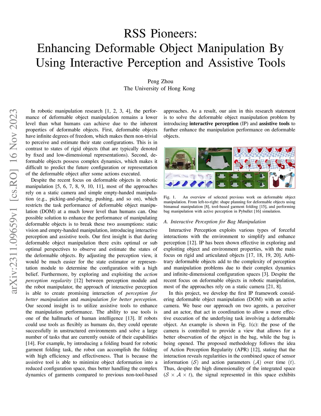 In the field of robotic manipulation, the proficiency of deformable object manipulation lags behind human capabilities due to the inherent characteristics of deformable objects. These objects have infinite degrees of freedom, resulting in non-trivial perception and state estimation, and complex dynamics, complicating the prediction of future configurations. Although recent research has focused on deformable object manipulation, most approaches rely on static vision and simple manipulation techniques, limiting the performance level. This paper proposes two solutions to enhance the performance: interactive perception and the use of assistive tools. The first solution posits that optimal perspectives exist during deformable object manipulation, facilitating easier state estimation. By exploring the action-perception regularity, interactive perception facilitates better manipulation and perception. The second solution advocates for the use of assistive tools, a hallmark of human intelligence, to improve manipulation performance. For instance, a folding board can aid in garment folding tasks by reducing object deformation and managing complex dynamics. Hence, this research aims to address the deformable object manipulation problem by incorporating interactive perception and assistive tools to augment manipulation performance.
