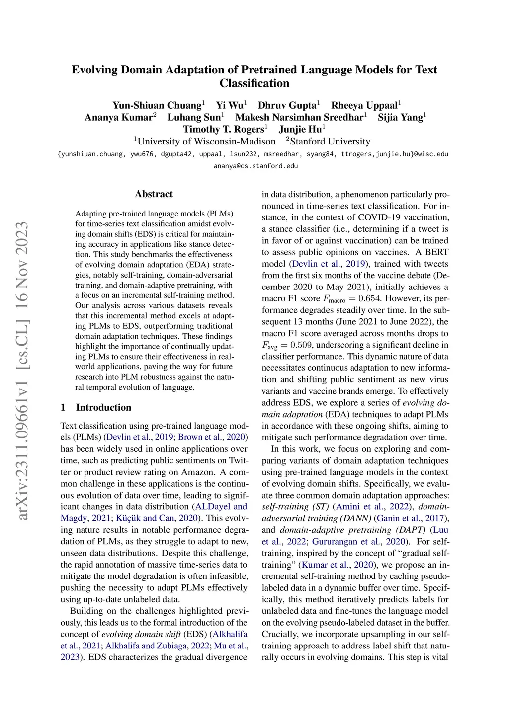 Adapting pre-trained language models (PLMs) for time-series text classification amidst evolving domain shifts (EDS) is critical for maintaining accuracy in applications like stance detection. This study benchmarks the effectiveness of evolving domain adaptation (EDA) strategies, notably self-training, domain-adversarial training, and domain-adaptive pretraining, with a focus on an incremental self-training method. Our analysis across various datasets reveals that this incremental method excels at adapting PLMs to EDS, outperforming traditional domain adaptation techniques. These findings highlight the importance of continually updating PLMs to ensure their effectiveness in real-world applications, paving the way for future research into PLM robustness against the natural temporal evolution of language.