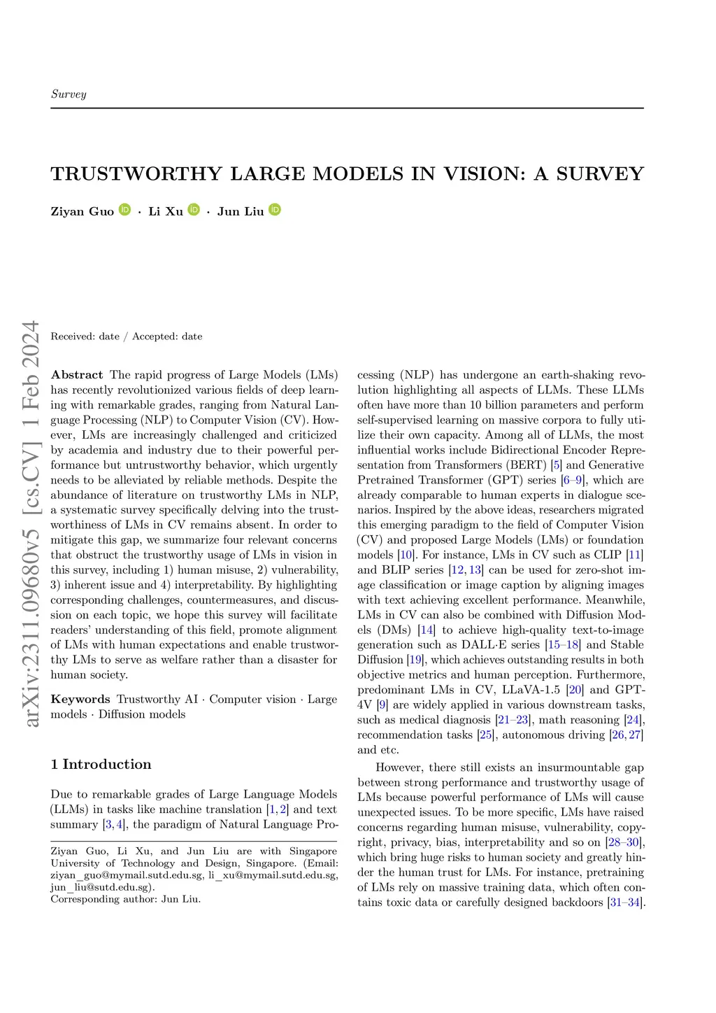 The rapid progress of Large Models (LMs) has recently revolutionized various fields of deep learning with remarkable grades, ranging from Natural Language Processing (NLP) to Computer Vision (CV). However, LMs are increasingly challenged and criticized by academia and industry due to their powerful performance but untrustworthy behavior, which urgently needs to be alleviated by reliable methods. Despite the abundance of literature on trustworthy LMs in NLP, a systematic survey specifically delving into the trustworthiness of LMs in CV remains absent. In order to mitigate this gap, we summarize four relevant concerns that obstruct the trustworthy usage in vision of LMs in this survey, including 1) human misuse, 2) vulnerability, 3) inherent issue and 4) interpretability. By highlighting corresponding challenge, countermeasures, and discussion in each topic, we hope this survey will facilitate readers' understanding of this field, promote alignment of LMs with human expectations and enable trustworthy LMs to serve as welfare rather than disaster for human society.