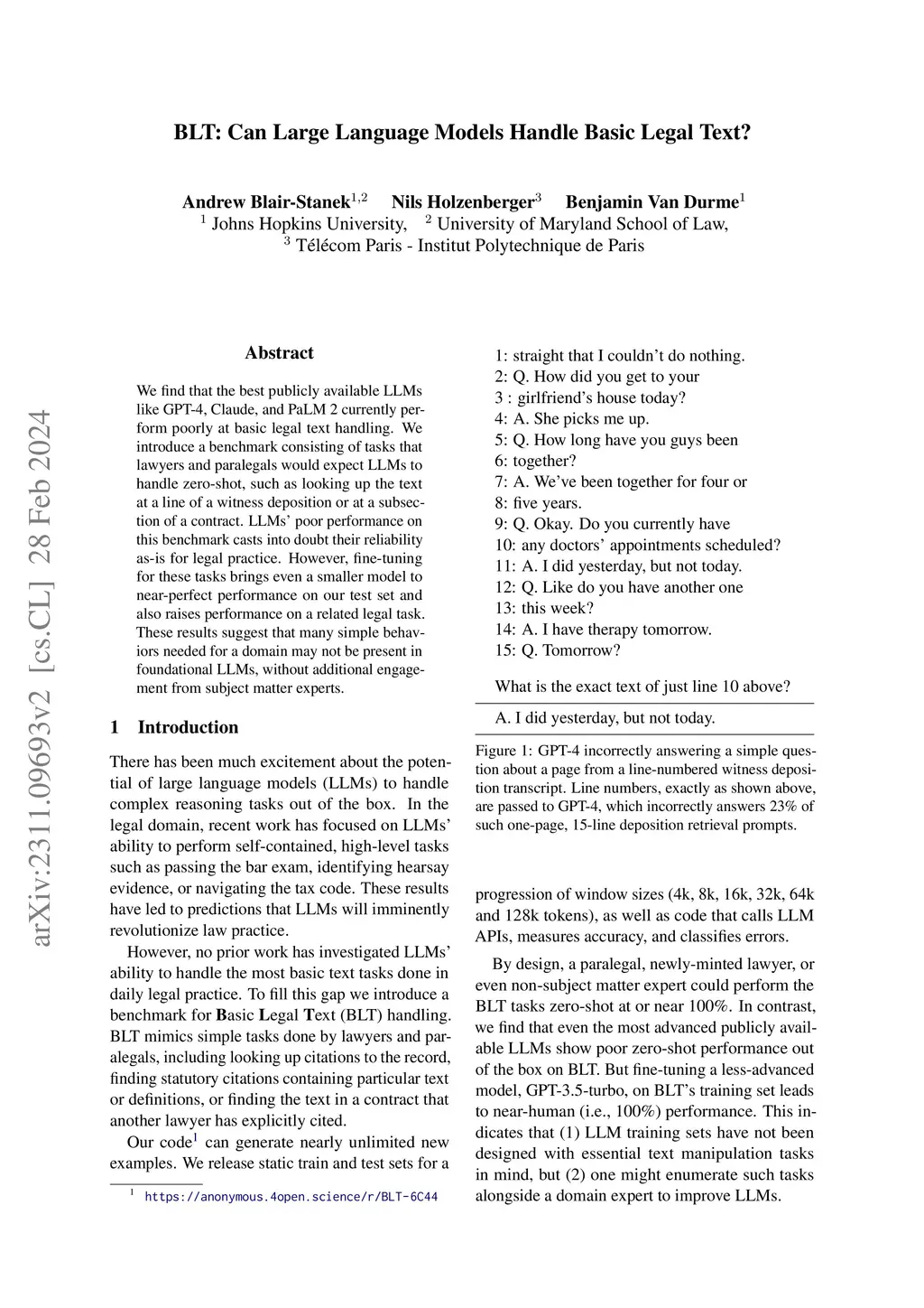 BLT: Can Large Language Models Handle Basic Legal Text?