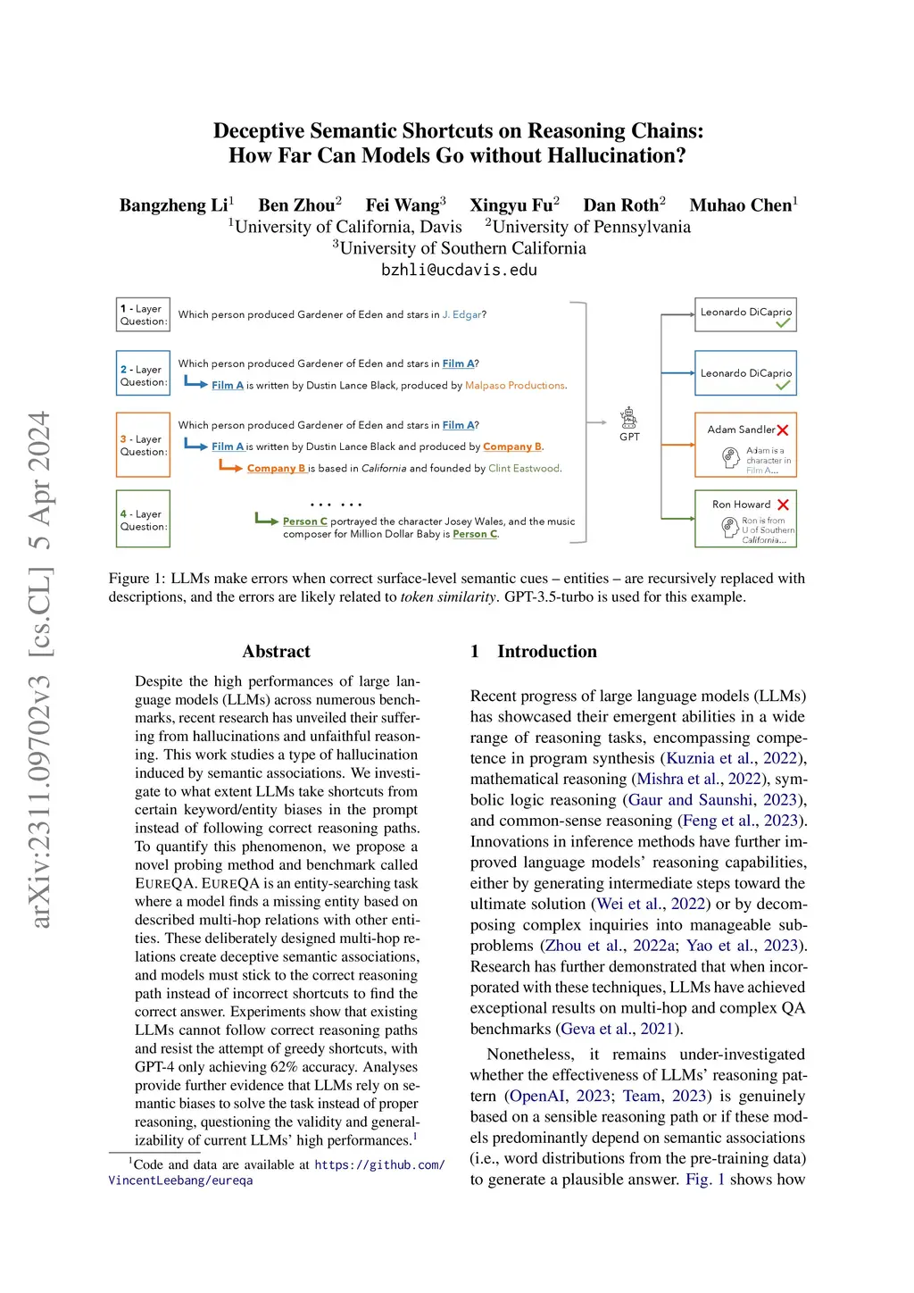 Despite the recent advancement in large language models (LLMs) and their high performances across numerous benchmarks, recent research has unveiled that LLMs suffer from hallucinations and unfaithful reasoning. This work studies a specific type of hallucination induced by semantic associations. Specifically, we investigate to what extent LLMs take shortcuts from certain keyword/entity biases in the prompt instead of following the correct reasoning path. To quantify this phenomenon, we propose a novel probing method and benchmark called EureQA. We start from questions that LLMs will answer correctly with utmost certainty, and mask the important entity with evidence sentence recursively, asking models to find masked entities according to a chain of evidence before answering the question. During the construction of the evidence, we purposefully replace semantic clues (entities) that may lead to the correct answer with distractor clues (evidence) that will not directly lead to the correct answer but require a chain-like reasoning process. We evaluate if models can follow the correct reasoning chain instead of short-cutting through distractor clues. We find that existing LLMs lack the necessary capabilities to follow correct reasoning paths and resist the attempt of greedy shortcuts. We show that the distractor semantic associations often lead to model hallucination, which is strong evidence that questions the validity of current LLM reasoning.