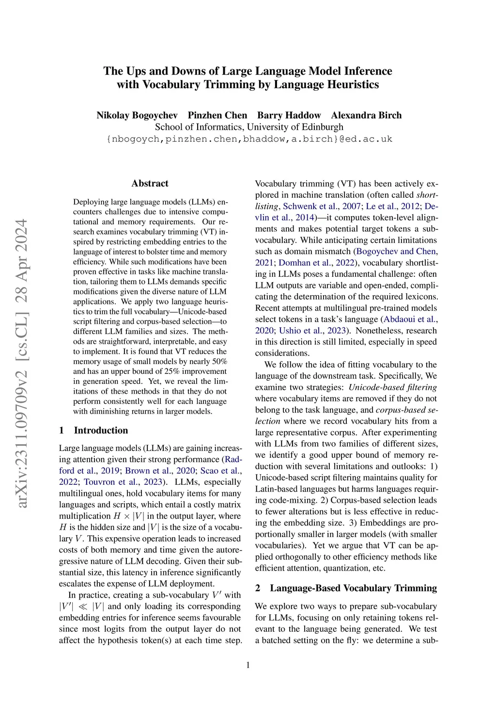 Deploying large language models (LLMs) encounters challenges due to intensive computational and memory requirements. Our research examines vocabulary trimming (VT) inspired by restricting embedding entries to the language of interest to bolster time and memory efficiency. While such modifications have been proven effective in tasks like machine translation, tailoring them to LLMs demands specific modifications given the diverse nature of LLM applications. We apply two language heuristics to trim the full vocabulary - Unicode-based script filtering and corpus-based selection - to different LLM families and sizes. The methods are straightforward, interpretable, and easy to implement. It is found that VT reduces the memory usage of small models by nearly 50% and has an upper bound of 25% improvement in generation speed. Yet, we reveal the limitations of these methods in that they do not perform consistently well for each language with diminishing returns in larger models.