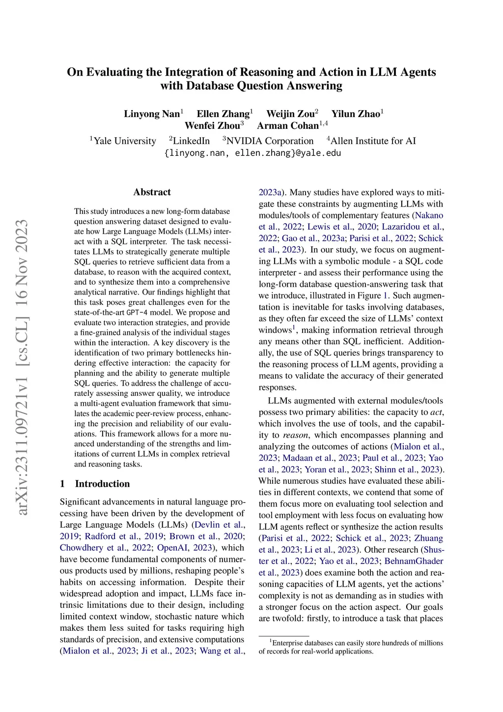 This study introduces a new long-form database question answering dataset designed to evaluate how Large Language Models (LLMs) interact with a SQL interpreter. The task necessitates LLMs to strategically generate multiple SQL queries to retrieve sufficient data from a database, to reason with the acquired context, and to synthesize them into a comprehensive analytical narrative. Our findings highlight that this task poses great challenges even for the state-of-the-art GPT-4 model. We propose and evaluate two interaction strategies, and provide a fine-grained analysis of the individual stages within the interaction. A key discovery is the identification of two primary bottlenecks hindering effective interaction: the capacity for planning and the ability to generate multiple SQL queries. To address the challenge of accurately assessing answer quality, we introduce a multi-agent evaluation framework that simulates the academic peer-review process, enhancing the precision and reliability of our evaluations. This framework allows for a more nuanced understanding of the strengths and limitations of current LLMs in complex retrieval and reasoning tasks.