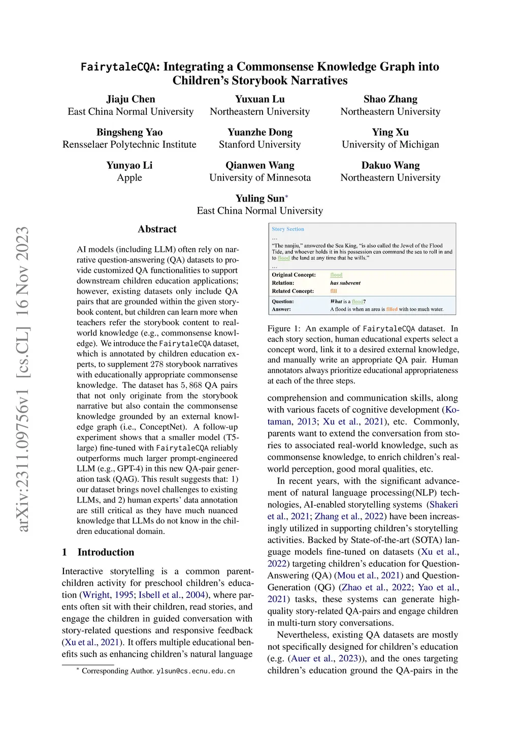 AI models (including LLM) often rely on narrative question-answering (QA) datasets to provide customized QA functionalities to support downstream children education applications; however, existing datasets only include QA pairs that are grounded within the given storybook content, but children can learn more when teachers refer the storybook content to real-world knowledge (e.g., commonsense knowledge). We introduce the FairytaleCQA dataset, which is annotated by children education experts, to supplement 278 storybook narratives with educationally appropriate commonsense knowledge. The dataset has 5,868 QA pairs that not only originate from the storybook narrative but also contain the commonsense knowledge grounded by an external knowledge graph (i.e., ConceptNet). A follow-up experiment shows that a smaller model (T5-large) fine-tuned with FairytaleCQA reliably outperforms much larger prompt-engineered LLM (e.g., GPT-4) in this new QA-pair generation task (QAG). This result suggests that: 1) our dataset brings novel challenges to existing LLMs, and 2) human experts' data annotation are still critical as they have much nuanced knowledge that LLMs do not know in the children educational domain.