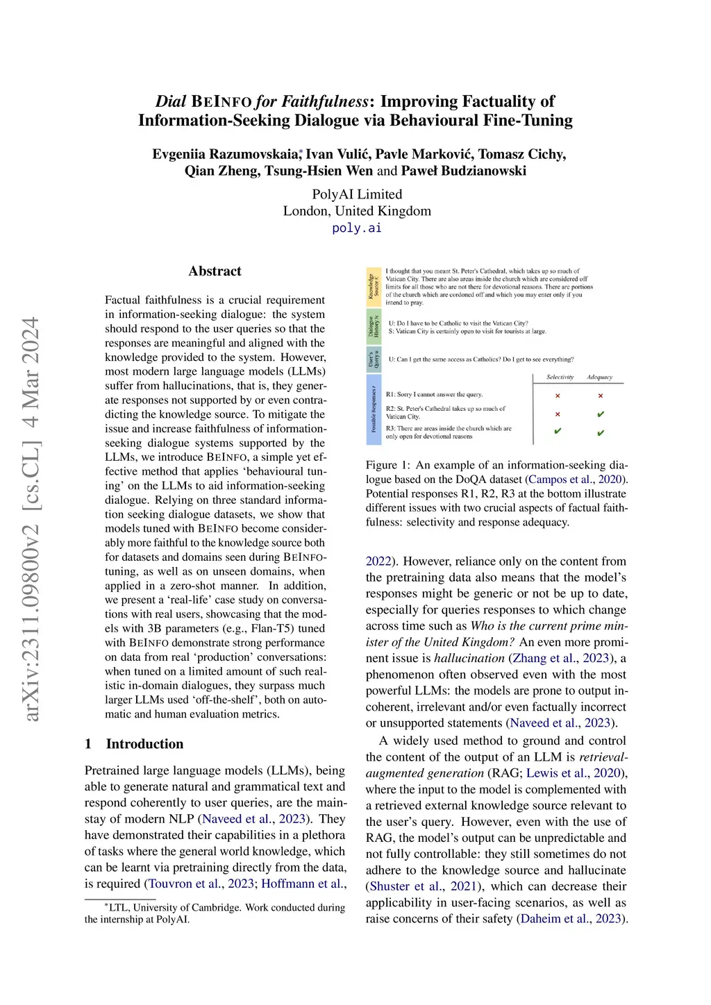 Factuality is a crucial requirement in information seeking dialogue: the system should respond to the user's queries so that the responses are meaningful and aligned with the knowledge provided to the system. However, most modern large language models suffer from hallucinations, that is, they generate responses not supported by or contradicting the knowledge source. To mitigate the issue and increase faithfulness of information-seeking dialogue systems, we introduce BeInfo, a simple yet effective method that applies behavioural tuning to aid information-seeking dialogue. Relying on three standard datasets, we show that models tuned with BeInfo} become considerably more faithful to the knowledge source both for datasets and domains seen during BeInfo-tuning, as well as on unseen domains, when applied in a zero-shot manner. In addition, we show that the models with 3B parameters (e.g., Flan-T5) tuned with BeInfo demonstrate strong performance on data from real `production' conversations and outperform GPT4 when tuned on a limited amount of such realistic in-domain dialogues.