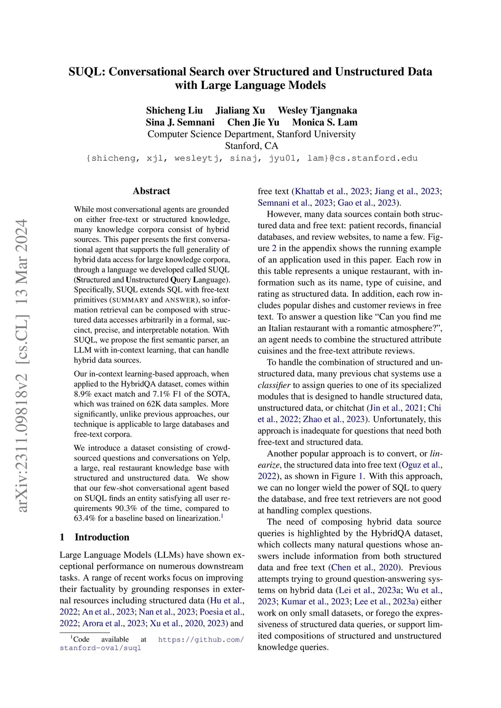 While most conversational agents are grounded on either free-text or structured knowledge, many knowledge corpora consist of hybrid sources. This paper presents the first conversational agent that supports the full generality of hybrid data access for large knowledge corpora, through a language we developed called SUQL (Structured and Unstructured Query Language). Specifically, SUQL extends SQL with free-text primitives (summary and answer), so information retrieval can be composed with structured data accesses arbitrarily in a formal, succinct, precise, and interpretable notation. With SUQL, we propose the first semantic parser, an LLM with in-context learning, that can handle hybrid data sources. Our in-context learning-based approach, when applied to the HybridQA dataset, comes within 8.9% exact match and 7.1% F1 of the SOTA, which was trained on 62K data samples. More significantly, unlike previous approaches, our technique is applicable to large databases and free-text corpora. We introduce a dataset consisting of crowdsourced questions and conversations on Yelp, a large, real restaurant knowledge base with structured and unstructured data. We show that our few-shot conversational agent based on SUQL finds an entity satisfying all user requirements 90.3% of the time, compared to 63.4% for a baseline based on linearization.