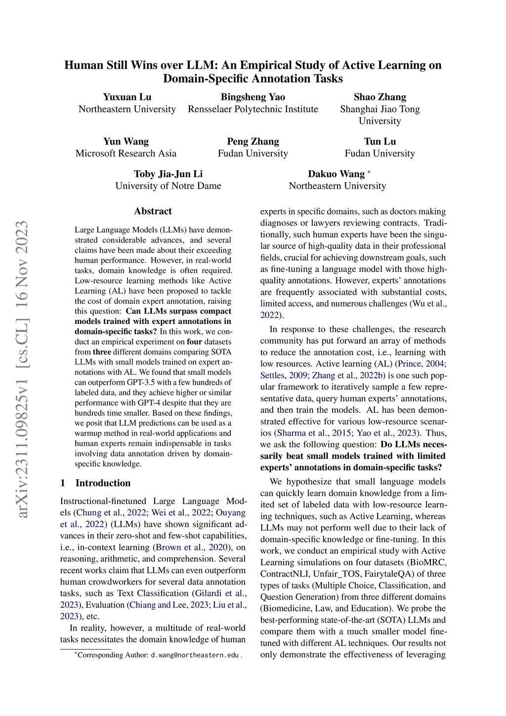 Large Language Models (LLMs) have demonstrated considerable advances, and several claims have been made about their exceeding human performance. However, in real-world tasks, domain knowledge is often required. Low-resource learning methods like Active Learning (AL) have been proposed to tackle the cost of domain expert annotation, raising this question: Can LLMs surpass compact models trained with expert annotations in domain-specific tasks? In this work, we conduct an empirical experiment on four datasets from three different domains comparing SOTA LLMs with small models trained on expert annotations with AL. We found that small models can outperform GPT-3.5 with a few hundreds of labeled data, and they achieve higher or similar performance with GPT-4 despite that they are hundreds time smaller. Based on these findings, we posit that LLM predictions can be used as a warmup method in real-world applications and human experts remain indispensable in tasks involving data annotation driven by domain-specific knowledge.