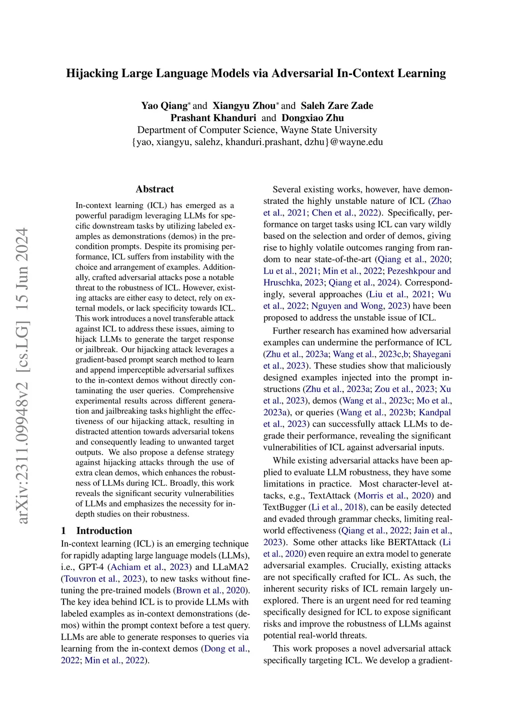 Hijacking Large Language Models via Adversarial In-Context Learning
