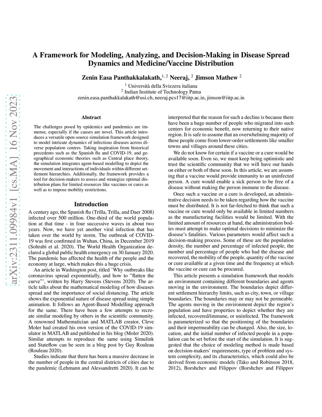 The challenges posed by epidemics and pandemics are immense, especially if the causes are novel. This article introduces a versatile open-source simulation framework designed to model intricate dynamics of infectious diseases across diverse population centres. Taking inspiration from historical precedents such as the Spanish flu and COVID-19, and geographical economic theories such as Central place theory, the simulation integrates agent-based modelling to depict the movement and interactions of individuals within different settlement hierarchies. Additionally, the framework provides a tool for decision-makers to assess and strategize optimal distribution plans for limited resources like vaccines or cures as well as to impose mobility restrictions.