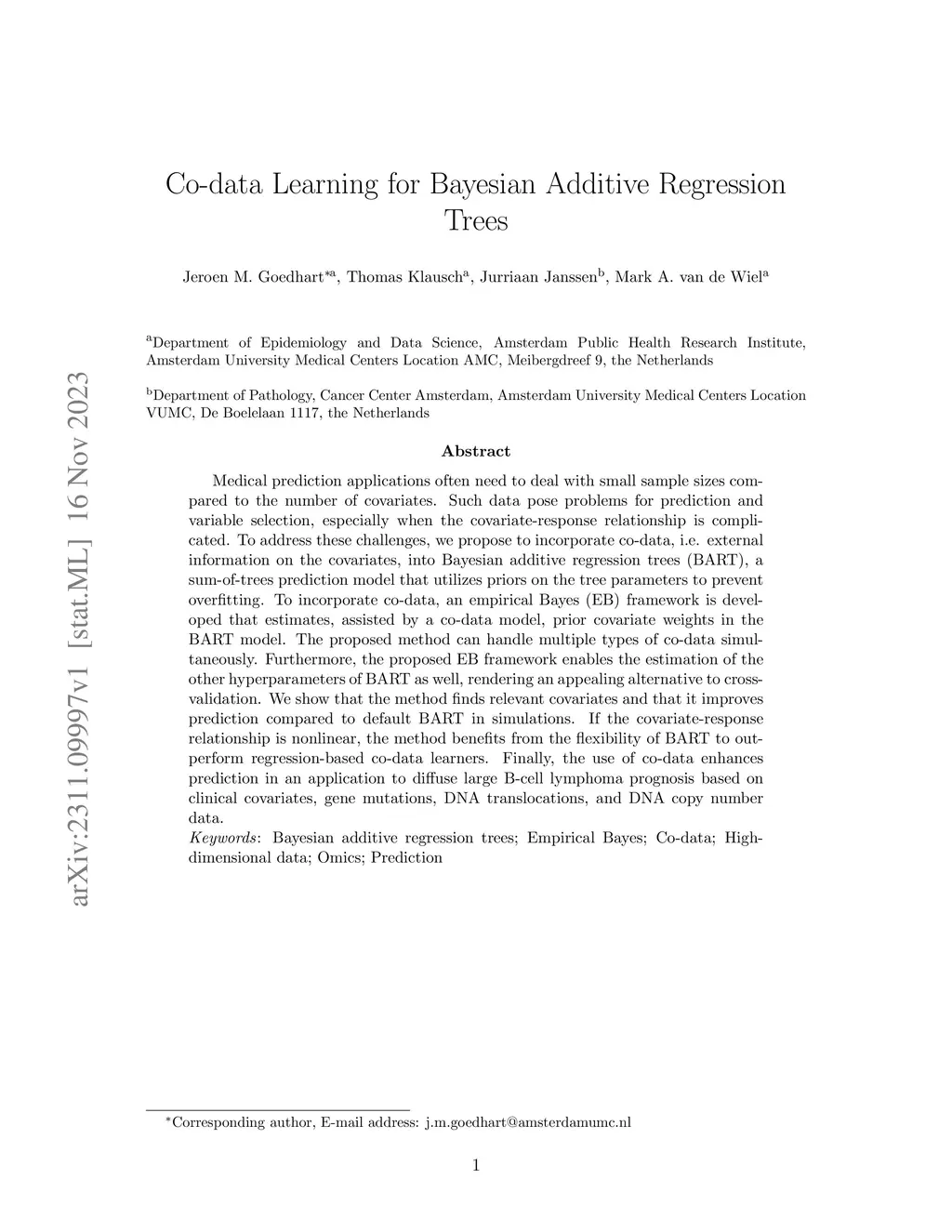 Medical prediction applications often need to deal with small sample sizes compared to the number of covariates. Such data pose problems for prediction and variable selection, especially when the covariate-response relationship is complicated. To address these challenges, we propose to incorporate co-data, i.e. external information on the covariates, into Bayesian additive regression trees (BART), a sum-of-trees prediction model that utilizes priors on the tree parameters to prevent overfitting. To incorporate co-data, an empirical Bayes (EB) framework is developed that estimates, assisted by a co-data model, prior covariate weights in the BART model. The proposed method can handle multiple types of co-data simultaneously. Furthermore, the proposed EB framework enables the estimation of the other hyperparameters of BART as well, rendering an appealing alternative to cross-validation. We show that the method finds relevant covariates and that it improves prediction compared to default BART in simulations. If the covariate-response relationship is nonlinear, the method benefits from the flexibility of BART to outperform regression-based co-data learners. Finally, the use of co-data enhances prediction in an application to diffuse large B-cell lymphoma prognosis based on clinical covariates, gene mutations, DNA translocations, and DNA copy number data. Keywords: Bayesian additive regression trees; Empirical Bayes; Co-data; High-dimensional data; Omics; Prediction
