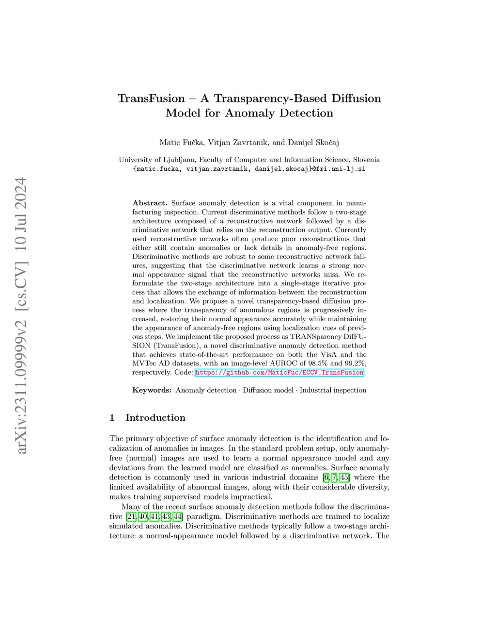 Surface anomaly detection is a vital component in manufacturing inspection. Current discriminative methods follow a two-stage architecture composed of a reconstructive network followed by a discriminative network that relies on the reconstruction output. Currently used reconstructive networks often produce poor reconstructions that either still contain anomalies or lack details in anomaly-free regions. Discriminative methods are robust to some reconstructive network failures, suggesting that the discriminative network learns a strong normal appearance signal that the reconstructive networks miss. We reformulate the two-stage architecture into a single-stage iterative process that allows the exchange of information between the reconstruction and localization. We propose a novel transparency-based diffusion process where the transparency of anomalous regions is progressively increased, restoring their normal appearance accurately while maintaining the appearance of anomaly-free regions using localization cues of previous steps. We implement the proposed process as TRANSparency DifFUSION (TransFusion), a novel discriminative anomaly detection method that achieves state-of-the-art performance on both the VisA and the MVTec AD datasets, with an image-level AUROC of 98.5% and 99.2%, respectively. Code: https://github.com/MaticFuc/ECCV_TransFusion