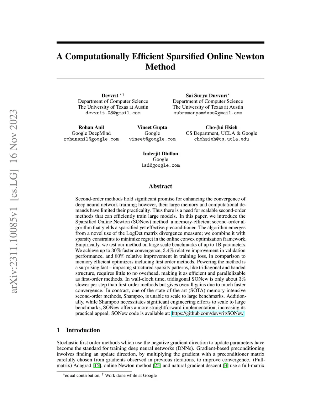 Second-order methods hold significant promise for enhancing the convergence of deep neural network training; however, their large memory and computational demands have limited their practicality. Thus there is a need for scalable second-order methods that can efficiently train large models. In this paper, we introduce the Sparsified Online Newton (SONew) method, a memory-efficient second-order algorithm that yields a sparsified yet effective preconditioner. The algorithm emerges from a novel use of the LogDet matrix divergence measure; we combine it with sparsity constraints to minimize regret in the online convex optimization framework. Empirically, we test our method on large scale benchmarks of up to 1B parameters. We achieve up to 30% faster convergence, 3.4% relative improvement in validation performance, and 80% relative improvement in training loss, in comparison to memory efficient optimizers including first order methods. Powering the method is a surprising fact -- imposing structured sparsity patterns, like tridiagonal and banded structure, requires little to no overhead, making it as efficient and parallelizable as first-order methods. In wall-clock time, tridiagonal SONew is only about 3% slower per step than first-order methods but gives overall gains due to much faster convergence. In contrast, one of the state-of-the-art (SOTA) memory-intensive second-order methods, Shampoo, is unable to scale to large benchmarks. Additionally, while Shampoo necessitates significant engineering efforts to scale to large benchmarks, SONew offers a more straightforward implementation, increasing its practical appeal. SONew code is available at: https://github.com/devvrit/SONew