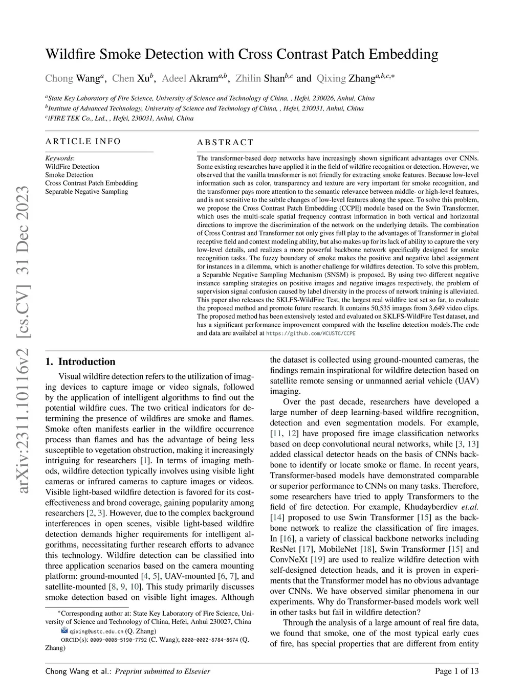 Vanilla Transformers focus on semantic relevance between mid- to high-level features and are not good at extracting smoke features as they overlook subtle changes in low-level features like color, transparency, and texture which are essential for smoke recognition. To address this, we propose the Cross Contrast Patch Embedding (CCPE) module based on the Swin Transformer. This module leverages multi-scale spatial contrast information in both vertical and horizontal directions to enhance the network's discrimination of underlying details. By combining Cross Contrast with Transformer, we exploit the advantages of Transformer in global receptive field and context modeling while compensating for its inability to capture very low-level details, resulting in a more powerful backbone network tailored for smoke recognition tasks. Additionally, we introduce the Separable Negative Sampling Mechanism (SNSM) to address supervision signal confusion during training and release the SKLFS-WildFire Test dataset, the largest real-world wildfire testset to date, for systematic evaluation. Extensive testing and evaluation on the benchmark dataset FIgLib and the SKLFS-WildFire Test dataset show significant performance improvements of the proposed method over baseline detection models. The code and data are available atthis http URL.