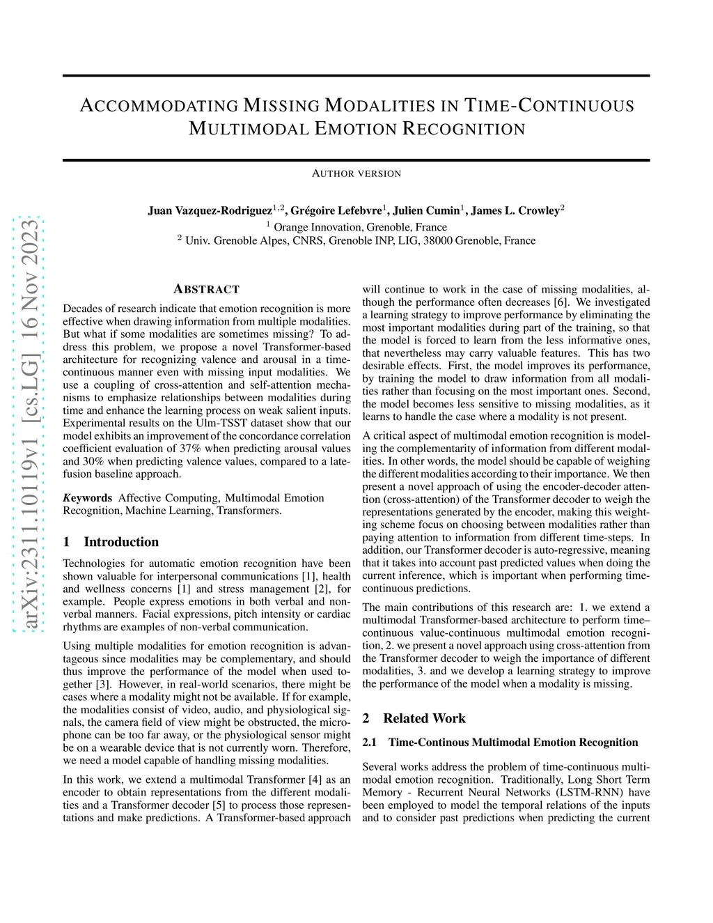 Decades of research indicate that emotion recognition is more effective when drawing information from multiple modalities. But what if some modalities are sometimes missing? To address this problem, we propose a novel Transformer-based architecture for recognizing valence and arousal in a time-continuous manner even with missing input modalities. We use a coupling of cross-attention and self-attention mechanisms to emphasize relationships between modalities during time and enhance the learning process on weak salient inputs. Experimental results on the Ulm-TSST dataset show that our model exhibits an improvement of the concordance correlation coefficient evaluation of 37% when predicting arousal values and 30% when predicting valence values, compared to a late-fusion baseline approach.