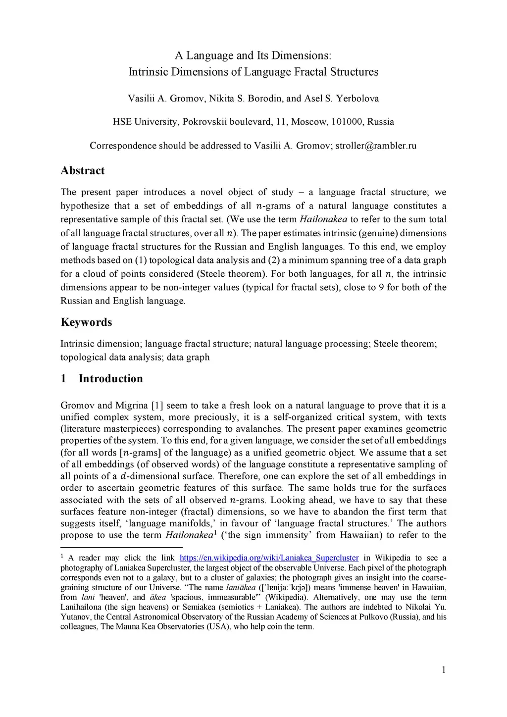 The present paper introduces a novel object of study - a language fractal structure. We hypothesize that a set of embeddings of all -grams of a natural language constitutes a representative sample of this fractal set. (We use the term Hailonakea to refer to the sum total of all language fractal structures, over all ). The paper estimates intrinsic (genuine) dimensions of language fractal structures for the Russian and English languages. To this end, we employ methods based on (1) topological data analysis and (2) a minimum spanning tree of a data graph for a cloud of points considered (Steele theorem). For both languages, for all , the intrinsic dimensions appear to be non-integer values (typical for fractal sets), close to 9 for both of the Russian and English language.