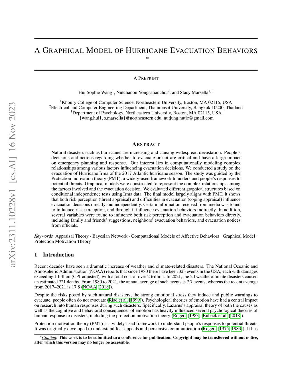 Natural disasters such as hurricanes are increasing and causing widespread devastation. People's decisions and actions regarding whether to evacuate or not are critical and have a large impact on emergency planning and response. Our interest lies in computationally modeling complex relationships among various factors influencing evacuation decisions. We conducted a study on the evacuation of Hurricane Irma of the 2017 Atlantic hurricane season. The study was guided by the Protection motivation theory (PMT), a widely-used framework to understand people's responses to potential threats. Graphical models were constructed to represent the complex relationships among the factors involved and the evacuation decision. We evaluated different graphical structures based on conditional independence tests using Irma data. The final model largely aligns with PMT. It shows that both risk perception (threat appraisal) and difficulties in evacuation (coping appraisal) influence evacuation decisions directly and independently. Certain information received from media was found to influence risk perception, and through it influence evacuation behaviors indirectly. In addition, several variables were found to influence both risk perception and evacuation behaviors directly, including family and friends' suggestions, neighbors' evacuation behaviors, and evacuation notices from officials.