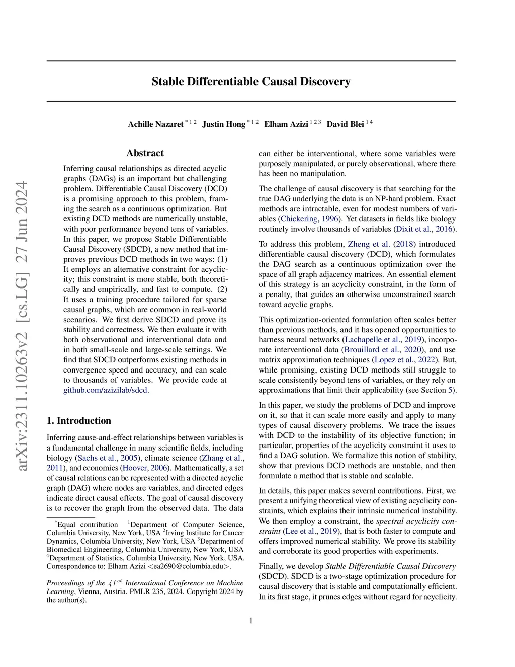 Inferring causal relationships as directed acyclic graphs (DAGs) is an important but challenging problem. Differentiable Causal Discovery (DCD) is a promising approach to this problem, framing the search as a continuous optimization. But existing DCD methods are numerically unstable, with poor performance beyond tens of variables. In this paper, we propose Stable Differentiable Causal Discovery (SDCD), a new method that improves previous DCD methods in two ways: (1) It employs an alternative constraint for acyclicity; this constraint is more stable, both theoretically and empirically, and fast to compute. (2) It uses a training procedure tailored for sparse causal graphs, which are common in real-world scenarios. We first derive SDCD and prove its stability and correctness. We then evaluate it with both observational and interventional data and on both small-scale and large-scale settings. We find that SDCD outperforms existing methods in both convergence speed and accuracy and can scale to thousands of variables. We provide code at https://github.com/azizilab/sdcd.