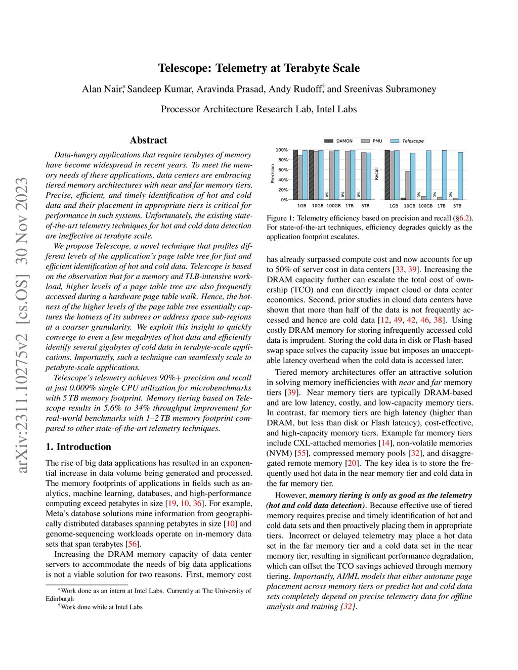 Data-hungry applications that require terabytes of memory have become widespread in recent years. To meet the memory needs of these applications, data centers are embracing tiered memory architectures with near and far memory tiers. Precise, efficient, and timely identification of hot and cold data and their placement in appropriate tiers is critical for performance in such systems. Unfortunately, the existing state-of-the-art telemetry techniques for hot and cold data detection are ineffective at the terabyte scale. We propose Telescope, a novel technique that profiles different levels of the application's page table tree for fast and efficient identification of hot and cold data. Telescope is based on the observation that, for a memory- and TLB-intensive workload, higher levels of a page table tree are also frequently accessed during a hardware page table walk. Hence, the hotness of the higher levels of the page table tree essentially captures the hotness of its subtrees or address space sub-regions at a coarser granularity. We exploit this insight to quickly converge on even a few megabytes of hot data and efficiently identify several gigabytes of cold data in terabyte-scale applications. Importantly, such a technique can seamlessly scale to petabyte-scale applications. Telescope's telemetry achieves 90%+ precision and recall at just 0.009% single CPU utilization for microbenchmarks with a 5 TB memory footprint. Memory tiering based on Telescope results in 5.6% to 34% throughput improvement for real-world benchmarks with a 1-2 TB memory footprint compared to other state-of-the-art telemetry techniques.