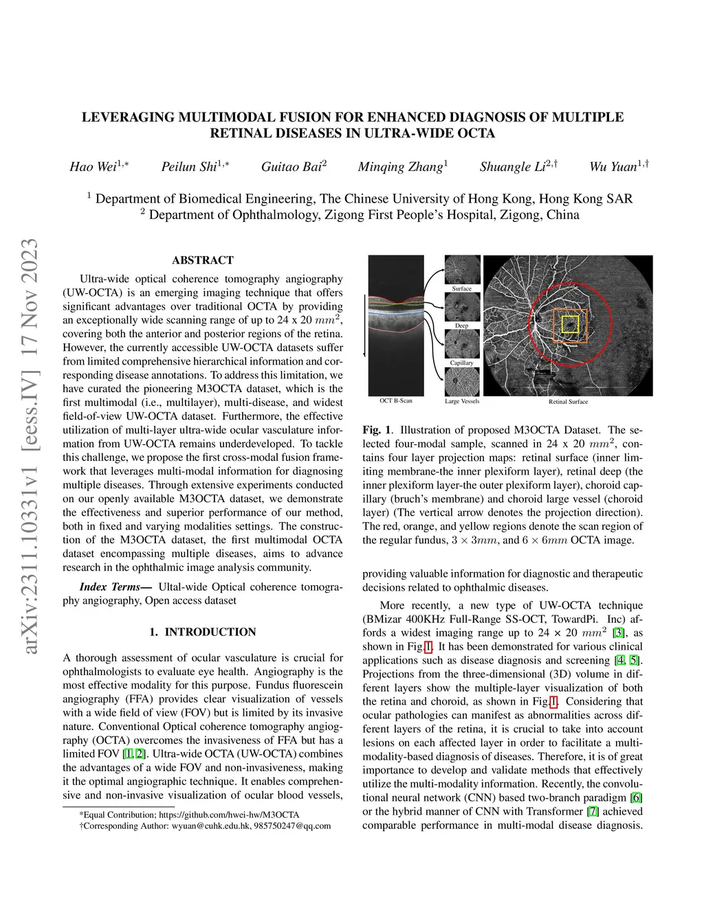 Ultra-wide optical coherence tomography angiography (UW-OCTA) is an emerging imaging technique that offers significant advantages over traditional OCTA by providing an exceptionally wide scanning range of up to 24 x 20 , covering both the anterior and posterior regions of the retina. However, the currently accessible UW-OCTA datasets suffer from limited comprehensive hierarchical information and corresponding disease annotations. To address this limitation, we have curated the pioneering M3OCTA dataset, which is the first multimodal (i.e., multilayer), multi-disease, and widest field-of-view UW-OCTA dataset. Furthermore, the effective utilization of multi-layer ultra-wide ocular vasculature information from UW-OCTA remains underdeveloped. To tackle this challenge, we propose the first cross-modal fusion framework that leverages multi-modal information for diagnosing multiple diseases. Through extensive experiments conducted on our openly available M3OCTA dataset, we demonstrate the effectiveness and superior performance of our method, both in fixed and varying modalities settings. The construction of the M3OCTA dataset, the first multimodal OCTA dataset encompassing multiple diseases, aims to advance research in the ophthalmic image analysis community.