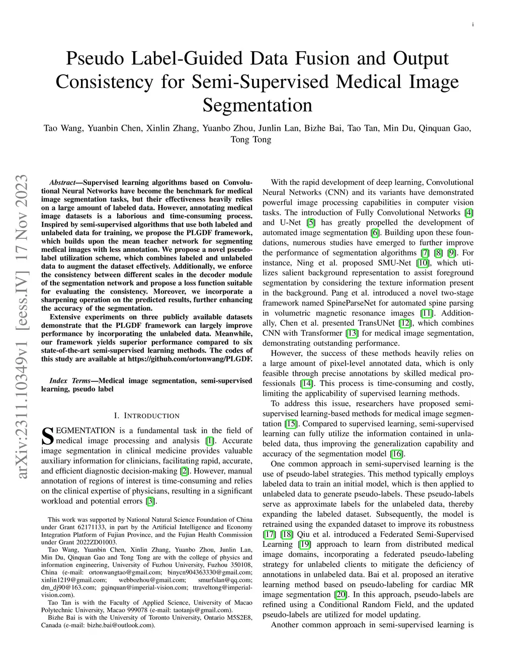 Supervised learning algorithms based on Convolutional Neural Networks have become the benchmark for medical image segmentation tasks, but their effectiveness heavily relies on a large amount of labeled data. However, annotating medical image datasets is a laborious and time-consuming process. Inspired by semi-supervised algorithms that use both labeled and unlabeled data for training, we propose the PLGDF framework, which builds upon the mean teacher network for segmenting medical images with less annotation. We propose a novel pseudo-label utilization scheme, which combines labeled and unlabeled data to augment the dataset effectively. Additionally, we enforce the consistency between different scales in the decoder module of the segmentation network and propose a loss function suitable for evaluating the consistency. Moreover, we incorporate a sharpening operation on the predicted results, further enhancing the accuracy of the segmentation. Extensive experiments on three publicly available datasets demonstrate that the PLGDF framework can largely improve performance by incorporating the unlabeled data. Meanwhile, our framework yields superior performance compared to six state-of-the-art semi-supervised learning methods. The codes of this study are available at https://github.com/ortonwang/PLGDF.