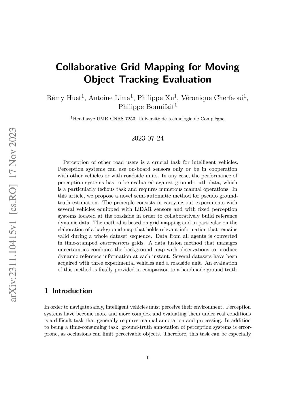 Perception of other road users is a crucial task for intelligent vehicles. Perception systems can use on-board sensors only or be in cooperation with other vehicles or with roadside units. In any case, the performance of perception systems has to be evaluated against ground-truth data, which is a particularly tedious task and requires numerous manual operations. In this article, we propose a novel semi-automatic method for pseudo ground-truth estimation. The principle consists in carrying out experiments with several vehicles equipped with LiDAR sensors and with fixed perception systems located at the roadside in order to collaboratively build reference dynamic data. The method is based on grid mapping and in particular on the elaboration of a background map that holds relevant information that remains valid during a whole dataset sequence. Data from all agents is converted in time-stamped observations grids. A data fusion method that manages uncertainties combines the background map with observations to produce dynamic reference information at each instant. Several datasets have been acquired with three experimental vehicles and a roadside unit. An evaluation of this method is finally provided in comparison to a handmade ground truth.