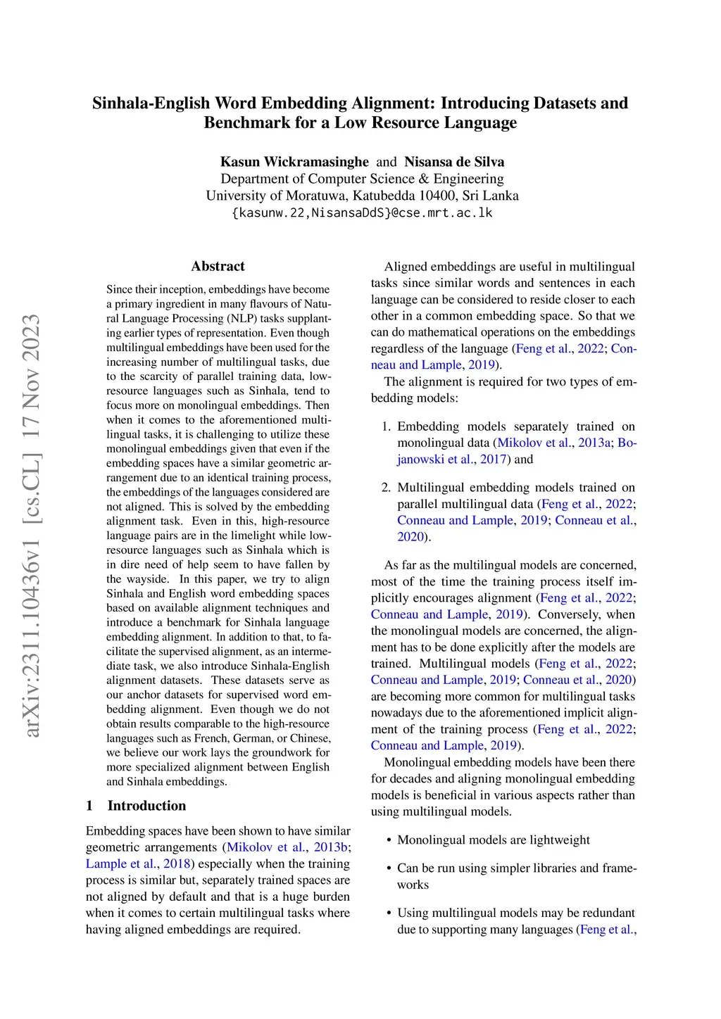 Sinhala-English Word Embedding Alignment: Introducing Datasets and