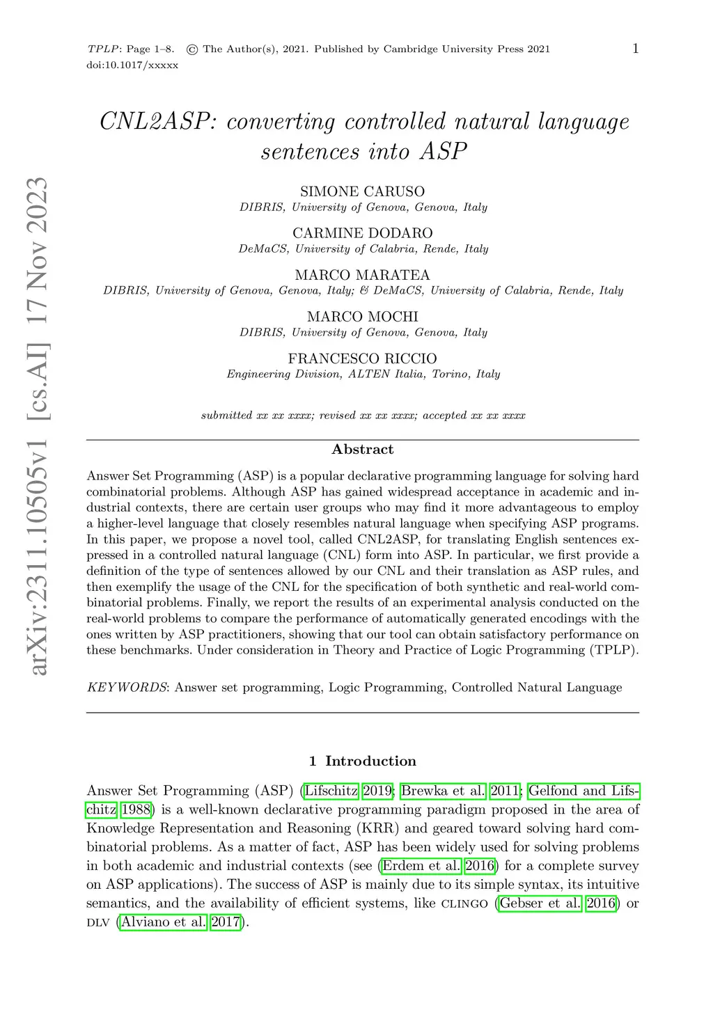 Answer Set Programming (ASP) is a popular declarative programming language for solving hard combinatorial problems. Although ASP has gained widespread acceptance in academic and industrial contexts, there are certain user groups who may find it more advantageous to employ a higher-level language that closely resembles natural language when specifying ASP programs. In this paper, we propose a novel tool, called CNL2ASP, for translating English sentences expressed in a controlled natural language (CNL) form into ASP. In particular, we first provide a definition of the type of sentences allowed by our CNL and their translation as ASP rules, and then exemplify the usage of the CNL for the specification of both synthetic and real-world combinatorial problems. Finally, we report the results of an experimental analysis conducted on the real-world problems to compare the performance of automatically generated encodings with the ones written by ASP practitioners, showing that our tool can obtain satisfactory performance on these benchmarks. Under consideration in Theory and Practice of Logic Programming (TPLP).