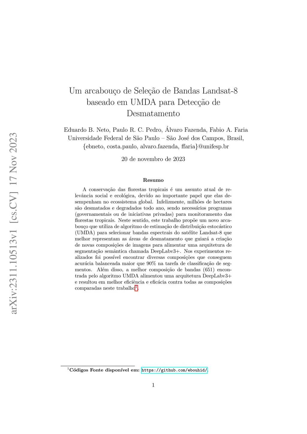 The conservation of tropical forests is a current subject of social and ecological relevance due to their crucial role in the global ecosystem. Unfortunately, millions of hectares are deforested and degraded each year. Therefore, government or private initiatives are needed for monitoring tropical forests. In this sense, this work proposes a novel framework, which uses of distribution estimation algorithm (UMDA) to select spectral bands from Landsat-8 that yield a better representation of deforestation areas to guide a semantic segmentation architecture called DeepLabv3+. In performed experiments, it was possible to find several compositions that reach balanced accuracy superior to 90% in segment classification tasks. Furthermore, the best composition (651) found by UMDA algorithm fed the DeepLabv3+ architecture and surpassed in efficiency and effectiveness all compositions compared in this work.