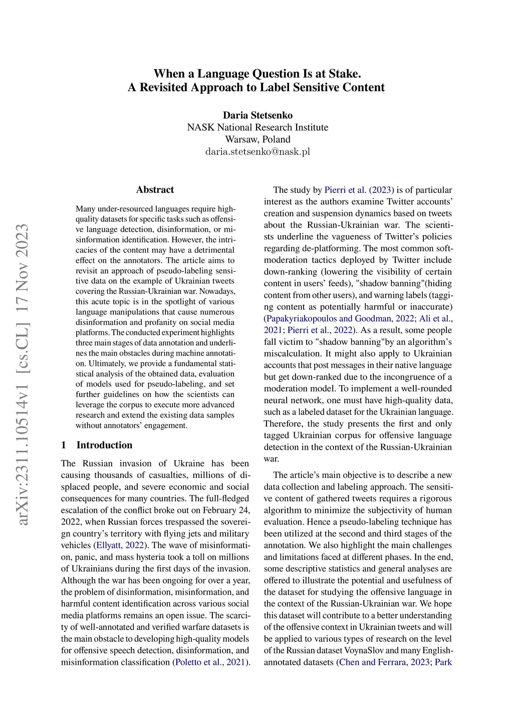 Many under-resourced languages require high-quality datasets for specific tasks such as offensive language detection, disinformation, or misinformation identification. However, the intricacies of the content may have a detrimental effect on the annotators. The article aims to revisit an approach of pseudo-labeling sensitive data on the example of Ukrainian tweets covering the Russian-Ukrainian war. Nowadays, this acute topic is in the spotlight of various language manipulations that cause numerous disinformation and profanity on social media platforms. The conducted experiment highlights three main stages of data annotation and underlines the main obstacles during machine annotation. Ultimately, we provide a fundamental statistical analysis of the obtained data, evaluation of models used for pseudo-labelling, and set further guidelines on how the scientists can leverage the corpus to execute more advanced research and extend the existing data samples without annotators' engagement.