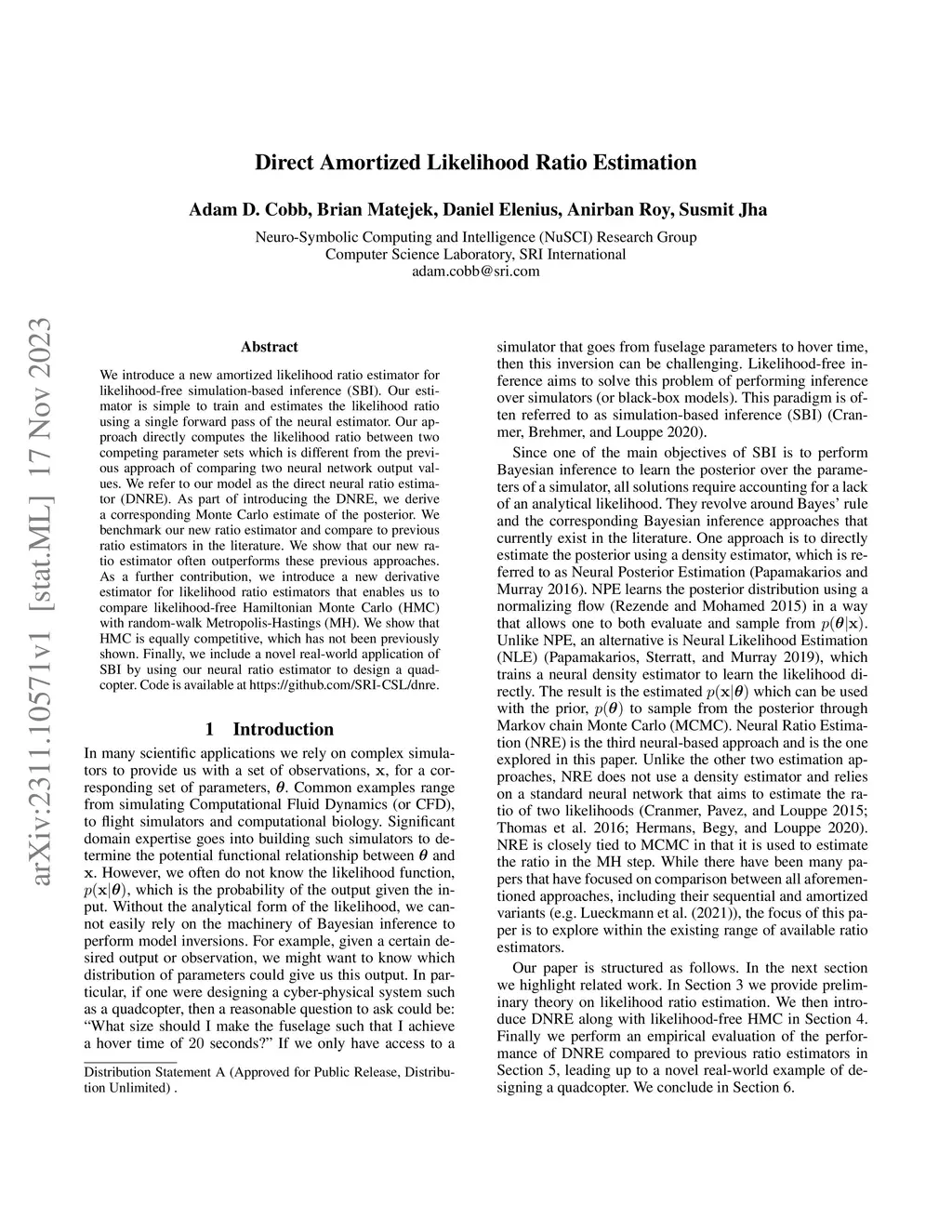 We introduce a new amortized likelihood ratio estimator for likelihood-free simulation-based inference (SBI). Our estimator is simple to train and estimates the likelihood ratio using a single forward pass of the neural estimator. Our approach directly computes the likelihood ratio between two competing parameter sets which is different from the previous approach of comparing two neural network output values. We refer to our model as the direct neural ratio estimator (DNRE). As part of introducing the DNRE, we derive a corresponding Monte Carlo estimate of the posterior. We benchmark our new ratio estimator and compare to previous ratio estimators in the literature. We show that our new ratio estimator often outperforms these previous approaches. As a further contribution, we introduce a new derivative estimator for likelihood ratio estimators that enables us to compare likelihood-free Hamiltonian Monte Carlo (HMC) with random-walk Metropolis-Hastings (MH). We show that HMC is equally competitive, which has not been previously shown. Finally, we include a novel real-world application of SBI by using our neural ratio estimator to design a quadcopter. Code is available at https://github.com/SRI-CSL/dnre.