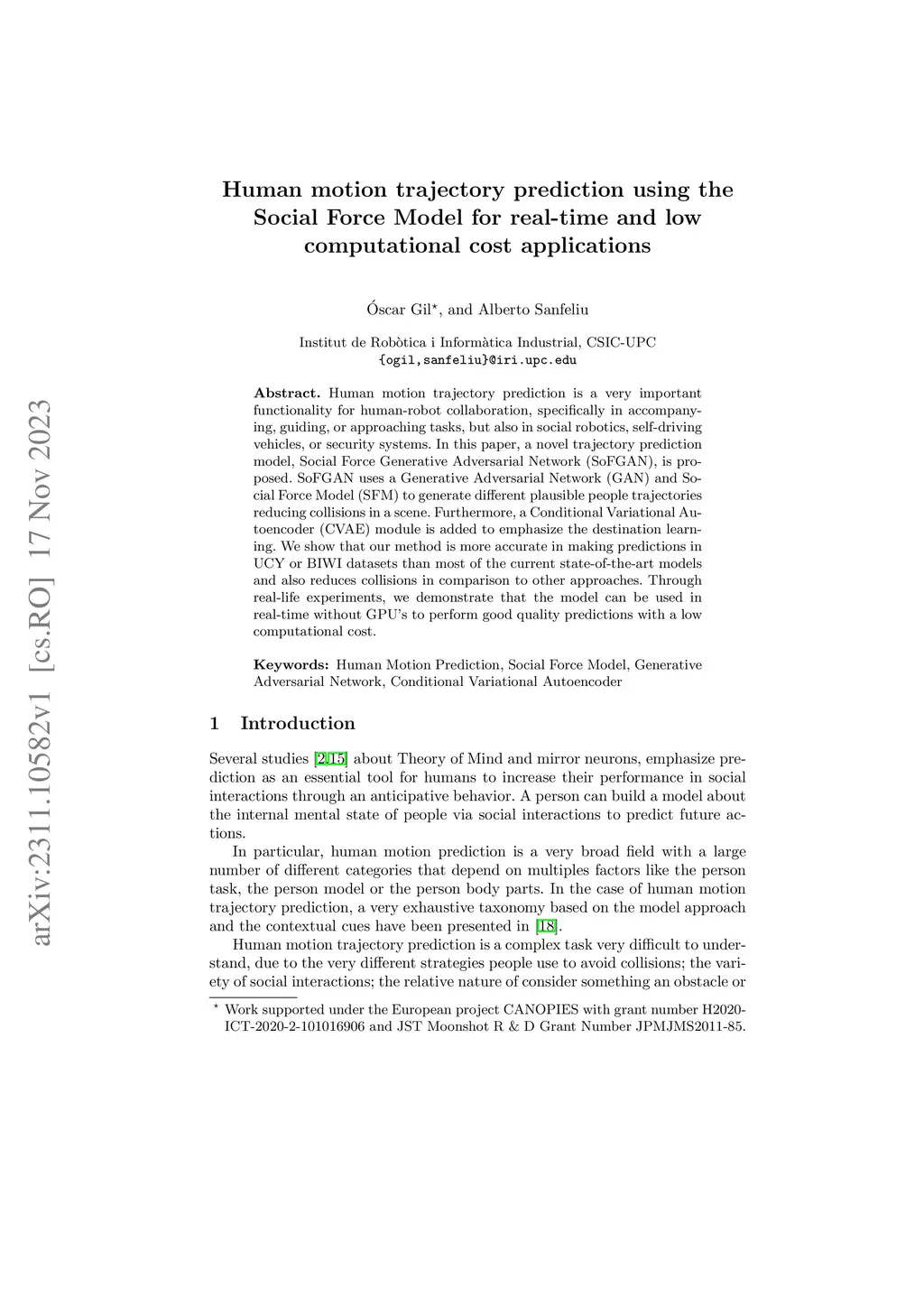 Human motion trajectory prediction is a very important functionality for human-robot collaboration, specifically in accompanying, guiding, or approaching tasks, but also in social robotics, self-driving vehicles, or security systems. In this paper, a novel trajectory prediction model, Social Force Generative Adversarial Network (SoFGAN), is proposed. SoFGAN uses a Generative Adversarial Network (GAN) and Social Force Model (SFM) to generate different plausible people trajectories reducing collisions in a scene. Furthermore, a Conditional Variational Autoencoder (CVAE) module is added to emphasize the destination learning. We show that our method is more accurate in making predictions in UCY or BIWI datasets than most of the current state-of-the-art models and also reduces collisions in comparison to other approaches. Through real-life experiments, we demonstrate that the model can be used in real-time without GPU's to perform good quality predictions with a low computational cost.