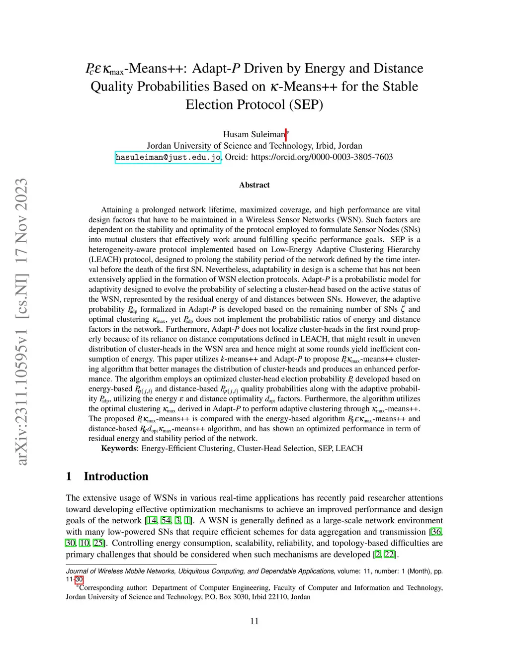 The adaptive probability formalized in Adapt- is developed based on the remaining number of SNs and optimal clustering , yet does not implement the probabilistic ratios of energy and distance factors in the network. Furthermore, Adapt- does not localize cluster-heads in the first round properly because of its reliance on distance computations defined in LEACH, that might result in uneven distribution of cluster-heads in the WSN area and hence might at some rounds yield inefficient consumption of energy. This paper utilizes \nolinebreak{\small{-}means\small{++}} and Adapt- to propose \nolinebreak{\small{-}means\small{++}} clustering algorithm that better manages the distribution of cluster-heads and produces an enhanced performance. The algorithm employs an optimized cluster-head election probability developed based on energy-based and distance-based quality probabilities along with the adaptive probability , utilizing the energy and distance optimality factors. Furthermore, the algorithm utilizes the optimal clustering derived in Adapt- to perform adaptive clustering through \nolinebreak{\small{-}means\small{++}}. The proposed \nolinebreak{{\small{-}}means{\small{++}}} is compared with the energy-based algorithm \nolinebreak{{\small{-}}means{\small{++}}} and distance-based \nolinebreak{{\small{-}}means{\small{++}}} algorithm, and has shown an optimized performance in term of residual energy and stability period of the network.