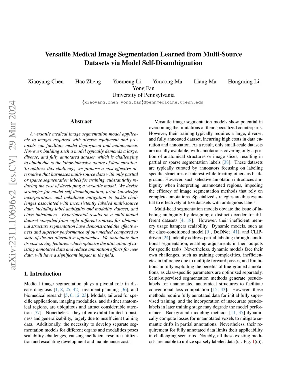 A versatile medical image segmentation model applicable to images acquired with diverse equipment and protocols can facilitate model deployment and maintenance. However, building such a model typically demands a large, diverse, and fully annotated dataset, which is challenging to obtain due to the labor-intensive nature of data curation. To address this challenge, we propose a cost-effective alternative that harnesses multi-source data with only partial or sparse segmentation labels for training, substantially reducing the cost of developing a versatile model. We devise strategies for model self-disambiguation, prior knowledge incorporation, and imbalance mitigation to tackle challenges associated with inconsistently labeled multi-source data, including label ambiguity and modality, dataset, and class imbalances. Experimental results on a multi-modal dataset compiled from eight different sources for abdominal structure segmentation have demonstrated the effectiveness and superior performance of our method compared to state-of-the-art alternative approaches. We anticipate that its cost-saving features, which optimize the utilization of existing annotated data and reduce annotation efforts for new data, will have a significant impact in the field.