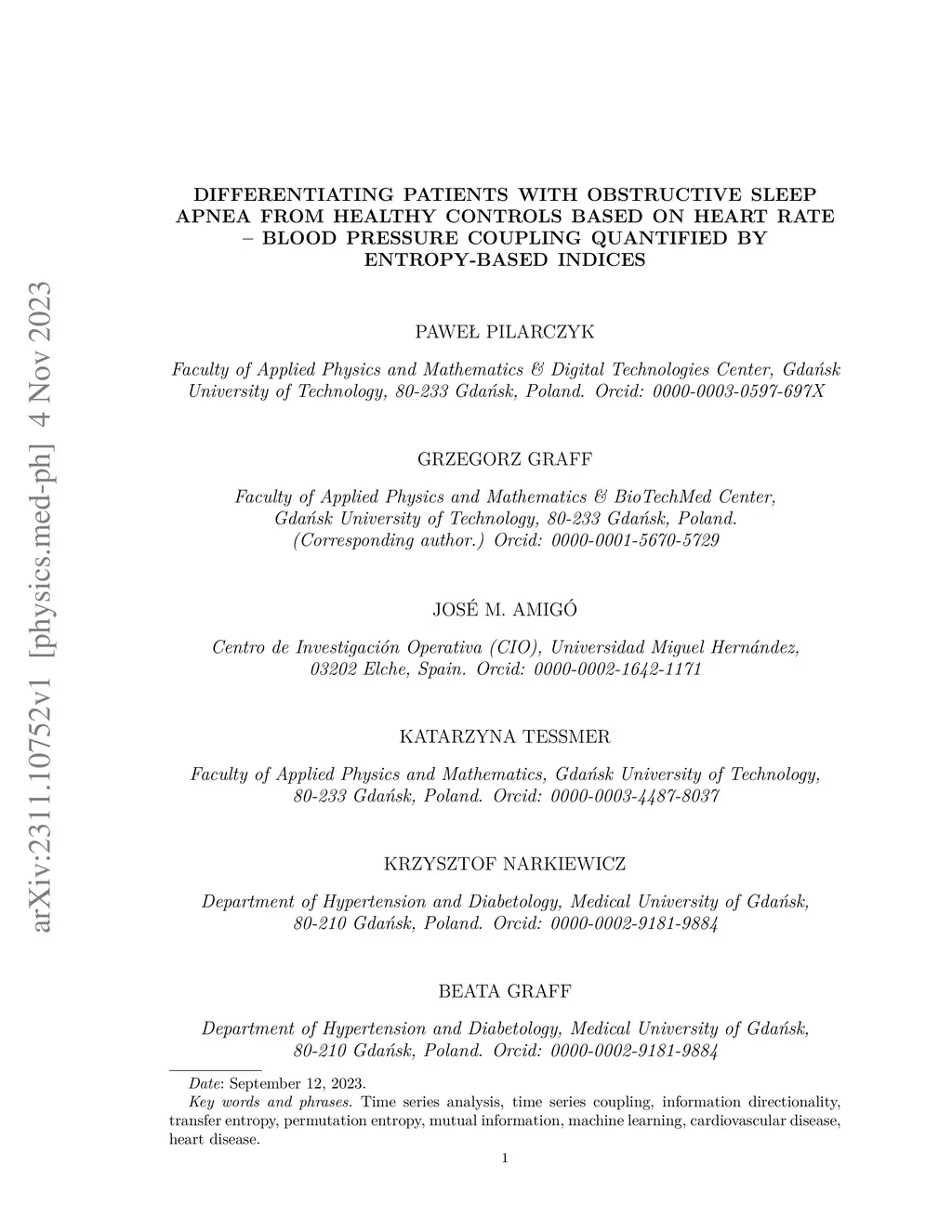 We introduce an entropy-based classification method for pairs of sequences (ECPS) for quantifying mutual dependencies in heart rate and beat-to-beat blood pressure recordings. The purpose of the method is to build a classifier for data in which each item consists of the two intertwined data series taken for each subject. The method is based on ordinal patterns, and uses entropy-like indices. Machine learning is used to select a subset of indices most suitable for our classification problem in order to build an optimal yet simple model for distinguishing between patients suffering from obstructive sleep apnea and a control group.