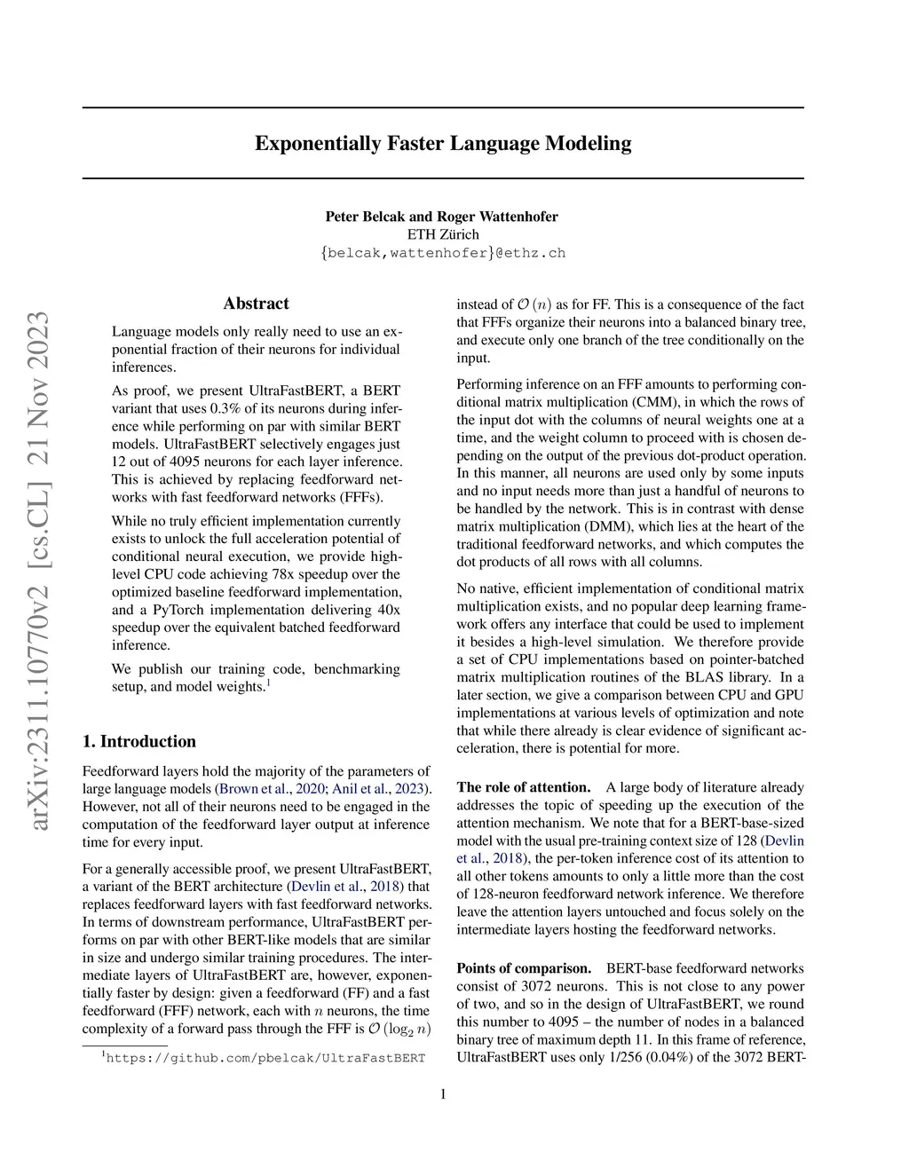Language models only really need to use an exponential fraction of their neurons for individual inferences. As proof, we present UltraFastBERT, a BERT variant that uses 0.3% of its neurons during inference while performing on par with similar BERT models. UltraFastBERT selectively engages just 12 out of 4095 neurons for each layer inference. This is achieved by replacing feedforward networks with fast feedforward networks (FFFs). While no truly efficient implementation currently exists to unlock the full acceleration potential of conditional neural execution, we provide high-level CPU code achieving 78x speedup over the optimized baseline feedforward implementation, and a PyTorch implementation delivering 40x speedup over the equivalent batched feedforward inference. We publish our training code, benchmarking setup, and model weights.