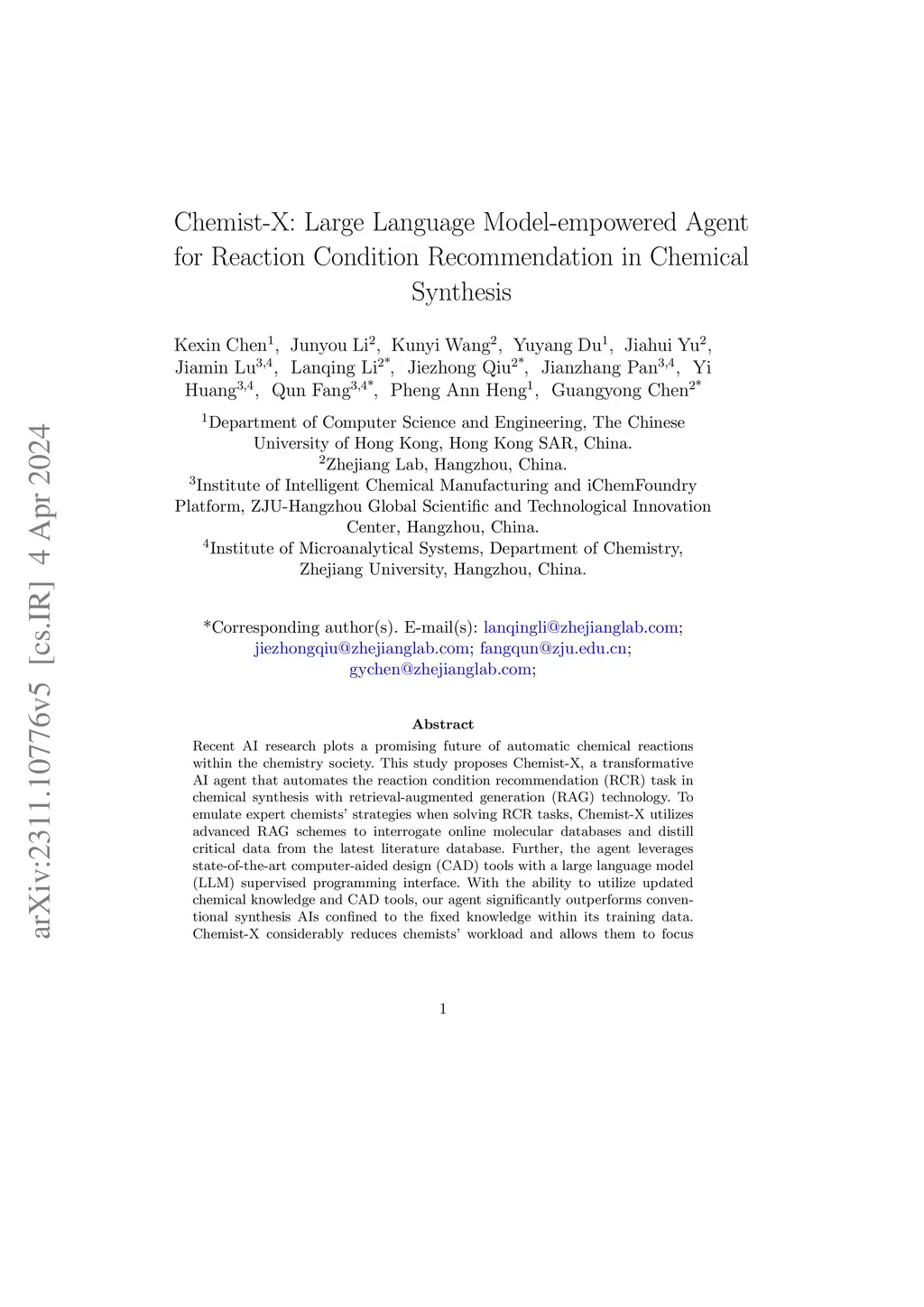 Recent AI research plots a promising future of automatic chemical reactions within the chemistry society. This study proposes Chemist-X, a transformative AI agent that automates the reaction condition recommendation (RCR) task in chemical synthesis with retrieval-augmented generation (RAG) technology. To emulate expert chemists' strategies when solving RCR tasks, Chemist-X utilizes advanced RAG schemes to interrogate online molecular databases and distill critical data from the latest literature database. Further, the agent leverages state-of-the-art computer-aided design (CAD) tools with a large language model (LLM) supervised programming interface. With the ability to utilize updated chemical knowledge and CAD tools, our agent significantly outperforms conventional synthesis AIs confined to the fixed knowledge within its training data. Chemist-X considerably reduces chemists' workload and allows them to focus on more fundamental and creative problems, thereby bringing closer computational techniques and chemical research and making a remarkable leap toward harnessing AI's full capabilities in scientific discovery.