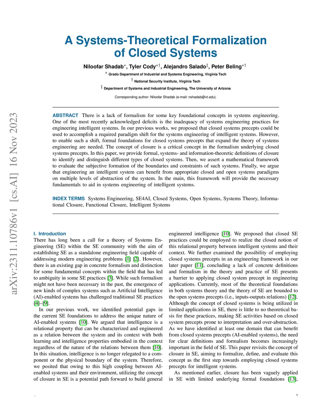 There is a lack of formalism for some key foundational concepts in systems engineering. One of the most recently acknowledged deficits is the inadequacy of systems engineering practices for engineering intelligent systems. In our previous works, we proposed that closed systems precepts could be used to accomplish a required paradigm shift for the systems engineering of intelligent systems. However, to enable such a shift, formal foundations for closed systems precepts that expand the theory of systems engineering are needed. The concept of closure is a critical concept in the formalism underlying closed systems precepts. In this paper, we provide formal, systems- and information-theoretic definitions of closure to identify and distinguish different types of closed systems. Then, we assert a mathematical framework to evaluate the subjective formation of the boundaries and constraints of such systems. Finally, we argue that engineering an intelligent system can benefit from appropriate closed and open systems paradigms on multiple levels of abstraction of the system. In the main, this framework will provide the necessary fundamentals to aid in systems engineering of intelligent systems.