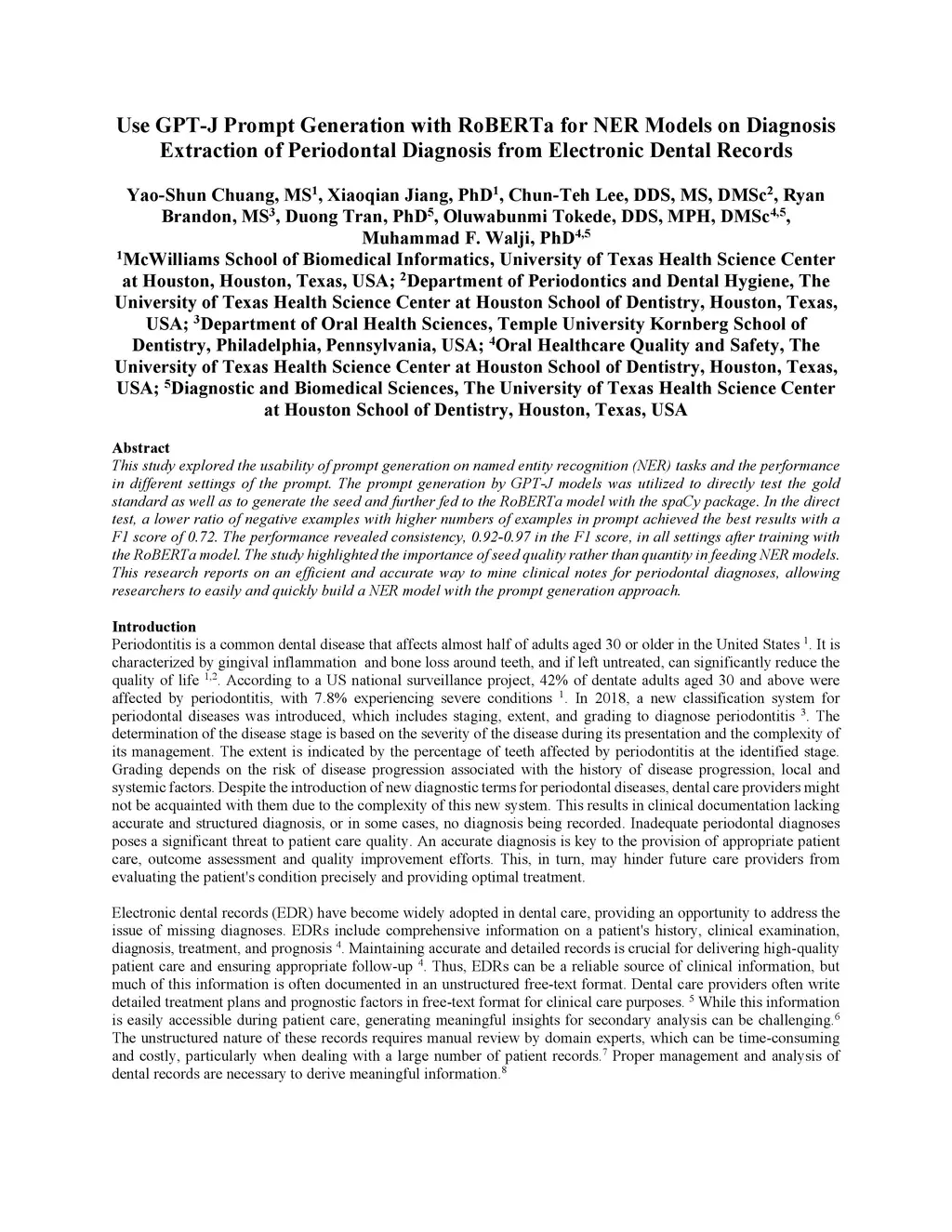 This study explored the usability of prompt generation on named entity recognition (NER) tasks and the performance in different settings of the prompt. The prompt generation by GPT-J models was utilized to directly test the gold standard as well as to generate the seed and further fed to the RoBERTa model with the spaCy package. In the direct test, a lower ratio of negative examples with higher numbers of examples in prompt achieved the best results with a F1 score of 0.72. The performance revealed consistency, 0.92-0.97 in the F1 score, in all settings after training with the RoBERTa model. The study highlighted the importance of seed quality rather than quantity in feeding NER models. This research reports on an efficient and accurate way to mine clinical notes for periodontal diagnoses, allowing researchers to easily and quickly build a NER model with the prompt generation approach.