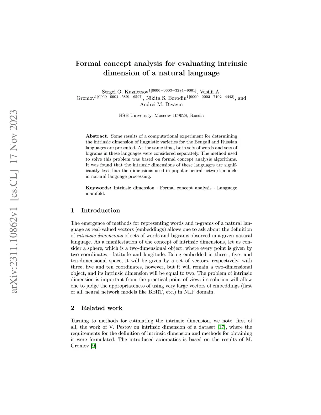 Some results of a computational experiment for determining the intrinsic dimension of linguistic varieties for the Bengali and Russian languages are presented. At the same time, both sets of words and sets of bigrams in these languages were considered separately. The method used to solve this problem was based on formal concept analysis algorithms. It was found that the intrinsic dimensions of these languages are significantly less than the dimensions used in popular neural network models in natural language processing.